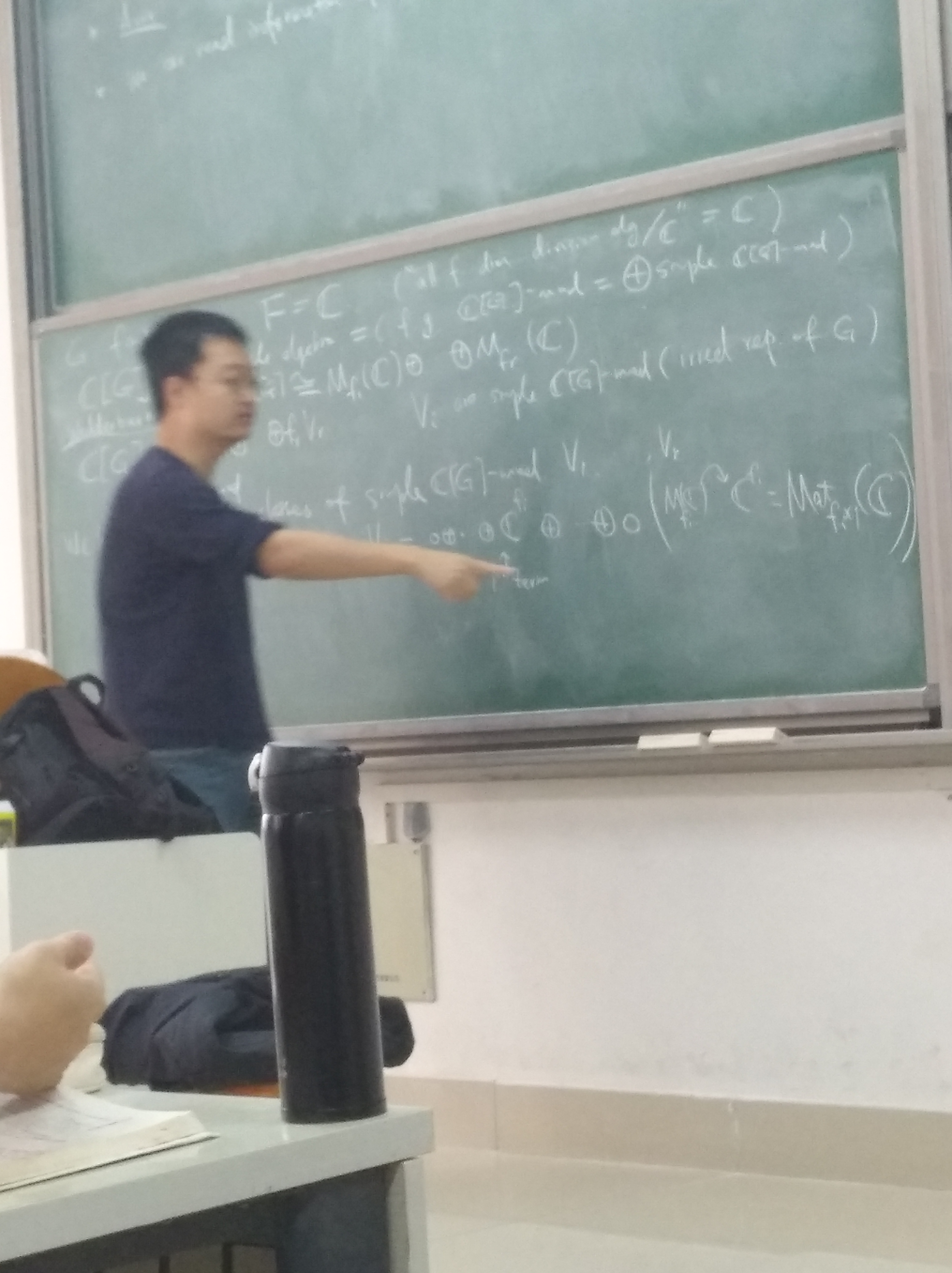 老师这门课用的教材就是欧阳毅那本(借鉴了很多书的)代数学,然后上课用英文念课本,但也不是完全的念课本。因为梁老师是做代数几何的,所以他在讲课的时候会讲一些概念的motivation,但由于本人还没有学过代数几何所以蒙古。总的来说讲的还是不错的,可以听得下去。值得一提的是这门课最后讲到诱导表示的时候梁老师结合zeta函数,以讲座的形式讲了最后两节课,吸引了一些人来,最后还扯到了langlands纲领(别看我,我什么都不会)。