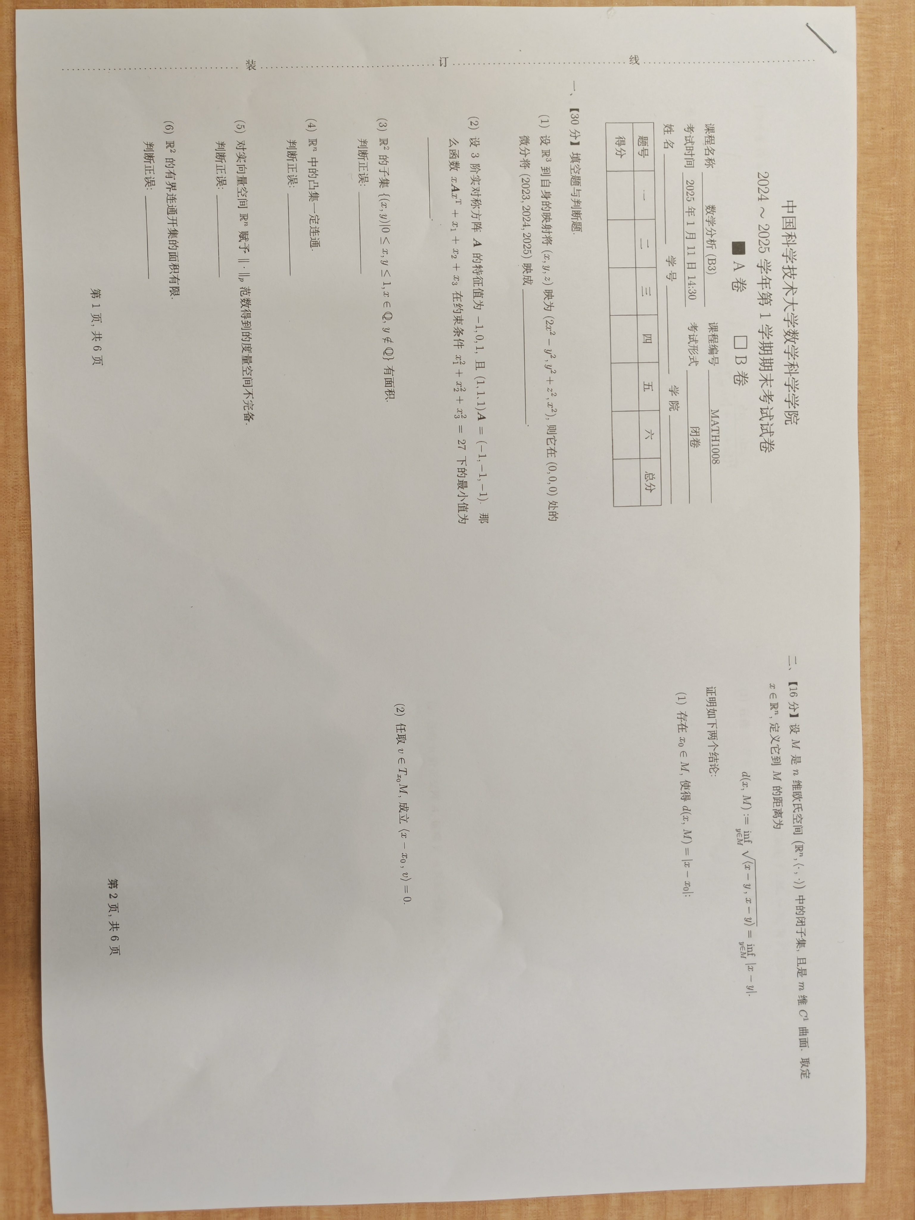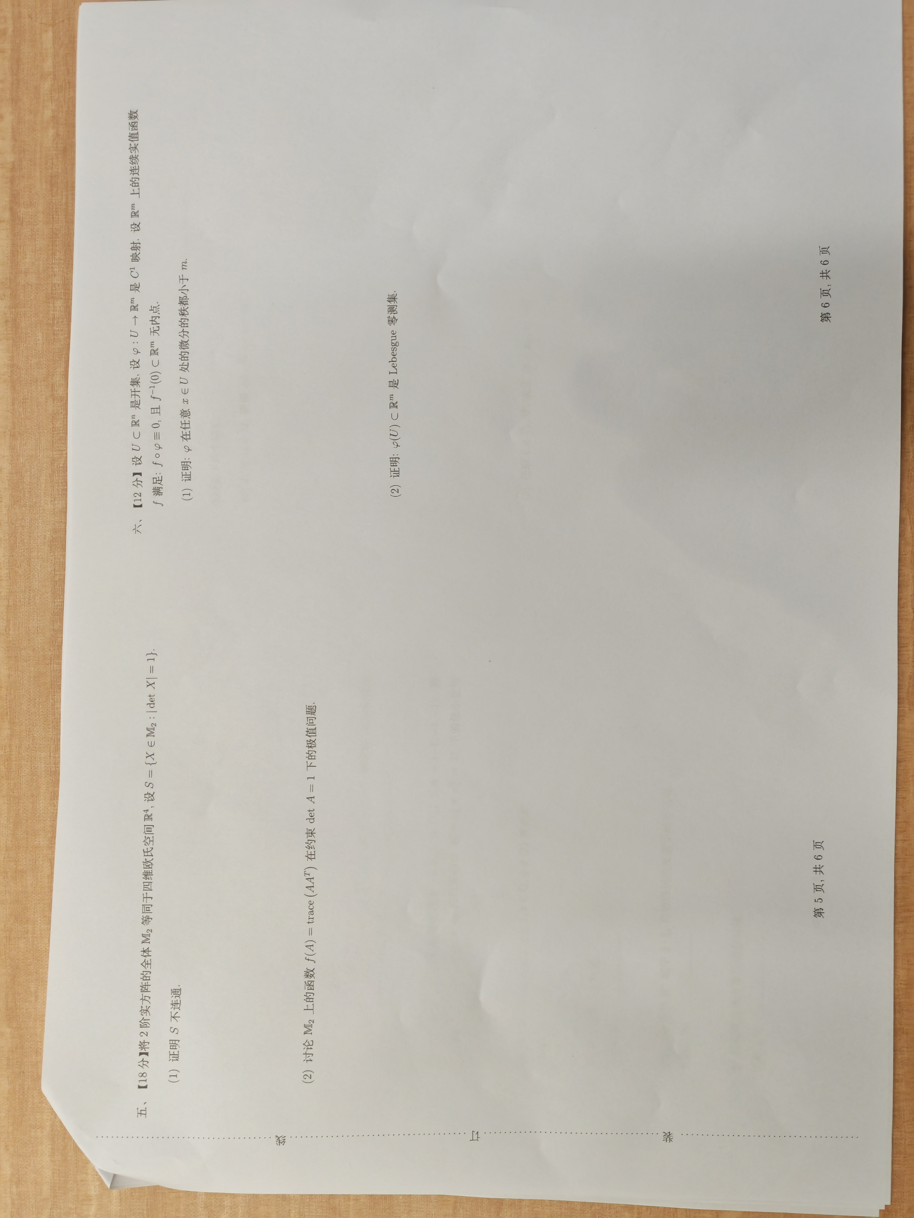 试卷难度不超过课本习题例题,所有的方法都是经典的,完全源于课本,并没有什么特殊的trick。对于学习的比较提前的同学,这门课并没有想象中那么难,或者说很多概念都已经学习了更一般的形式了,再回来看特殊情况反而并没有多难。点集拓扑、微分流形前一小部分(大概是wzq老师讲义前7个lecture)、实分析中测度的构造和积分的定义已经能完全覆盖课本绝大部分知识点,某种意义上这门课是最不需要花时间的一门课(因为花在其他内容上学到的东西已经能够帮你应付考试中的所有较难的题目了)。