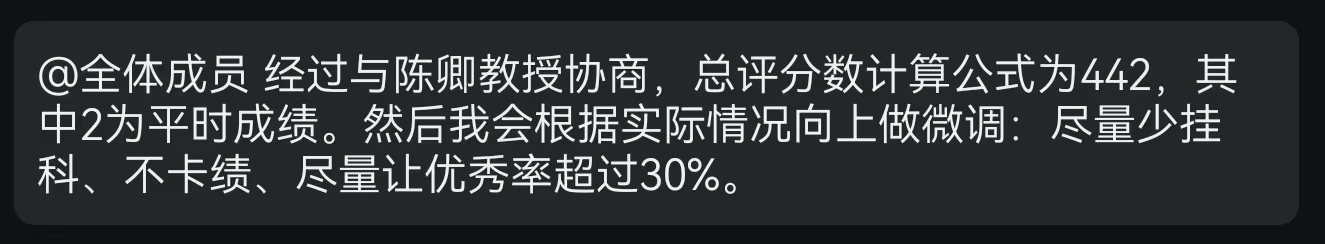从目前的信息猜测给分是235(5取期中期末max),取max这事我觉得只有在期中期末均分差不多的情况下才比较合理,像这学期期末均分比期中低了15分,期中均分期末比均分高15和期末均分期中比均分高15两种情况总评就差一档,但也不见得期中一定比期末更重要更有区分度(不过这当然也只是因为这种算法刚好对我不利随便口嗨两句,不介意的同学可以不管,毕竟转数必修B3大家也没什么别的选择对吧🤣但如果能选还是建议选隔壁,班上摆得多而且会调分,反正不点名不小测,实在注重老师讲课水平的平时来cq班听课就是了
