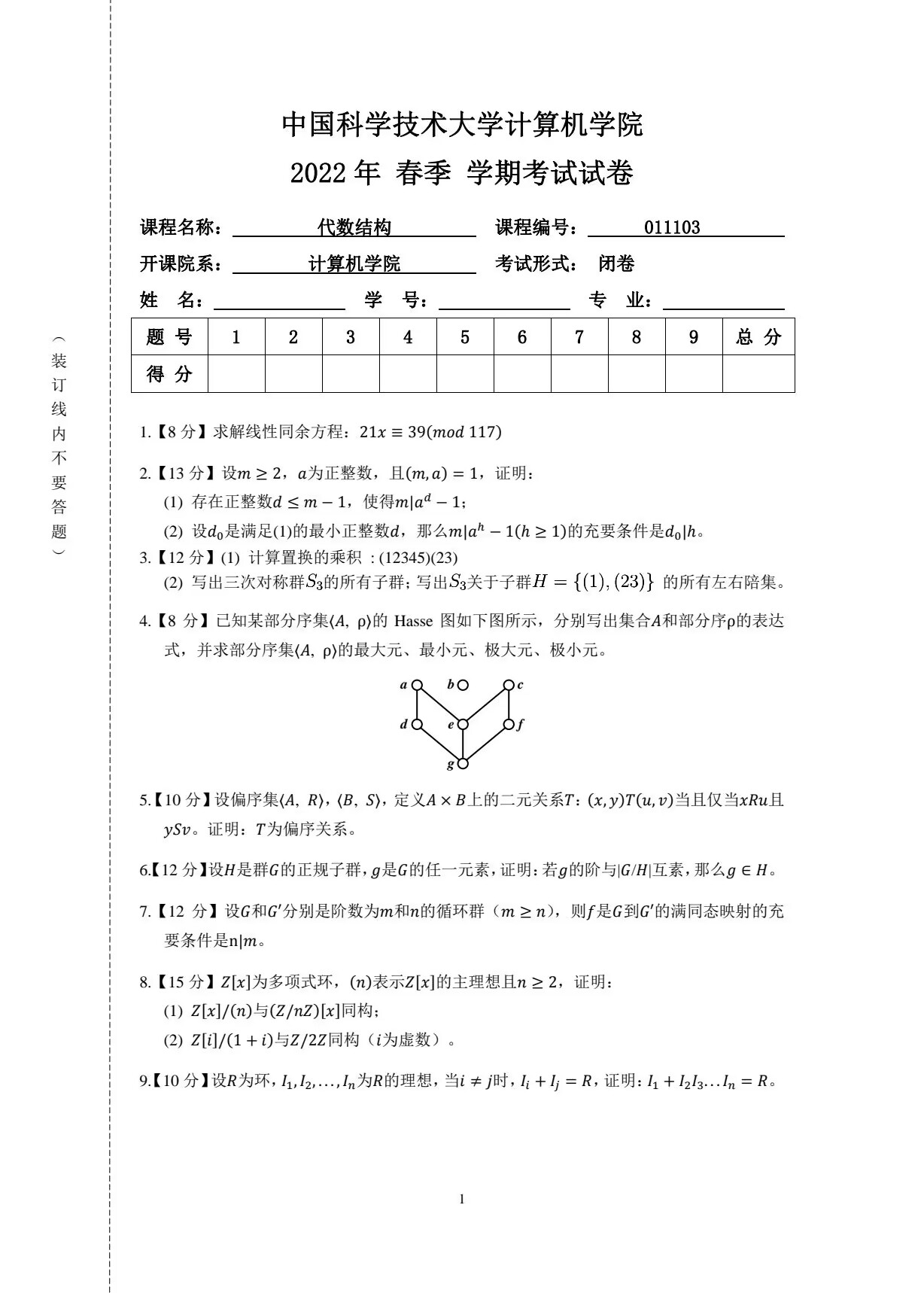 期末考前在评课社区上淘了几份往年卷试了下手, 感觉还比较容易. 没想到22年的期末考试难度陡增, 但相应地几位老师也往高调分了. 如果你学得比较融会贯通, 题目绝对难度不会成为问题. 至少不管怎么说, 常规题 (比如解同余方程, 画偏序关系) 总是可以拿满分的.