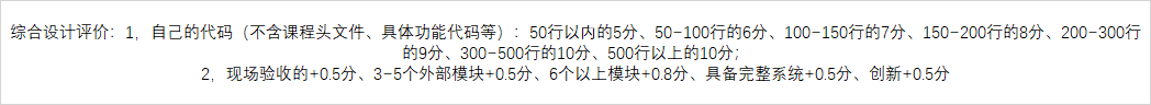 这份评分标准是在大作业截止之后发布的,其中“自己的代码”指的是PPT上没有的代码。虽然这样是为了防止PPT缝合怪的出现,但是个人感觉按代码行数给分还是有点。。。事实上,从给分情况上来说根本没有区分。基本上就算按行数给分的。不过我写的是使用OLED(课上没讲的元件)展示的贪吃蛇,所以代码行数直接赢麻了(笑)。估计李老师也在探索该如何给分才能更加公平,而且评课社区以前似乎没有提到过具体的评分标准,所以以后也不知道会不会改进。