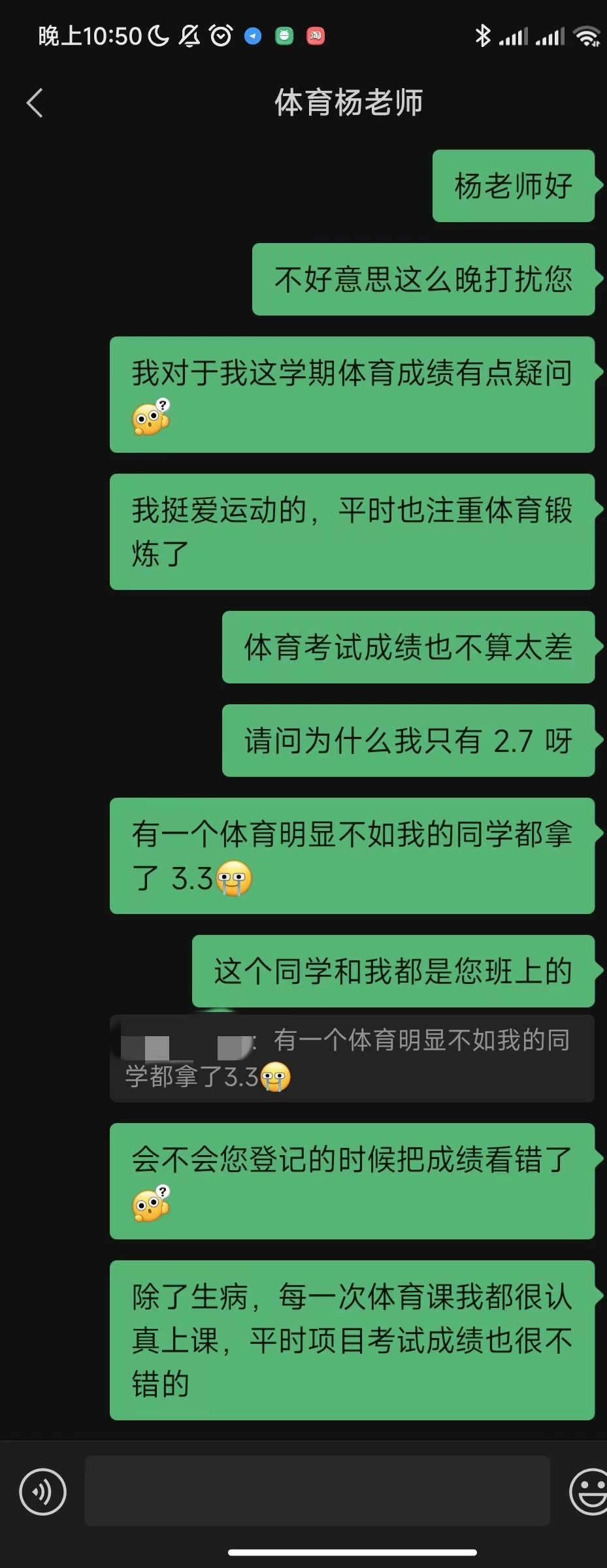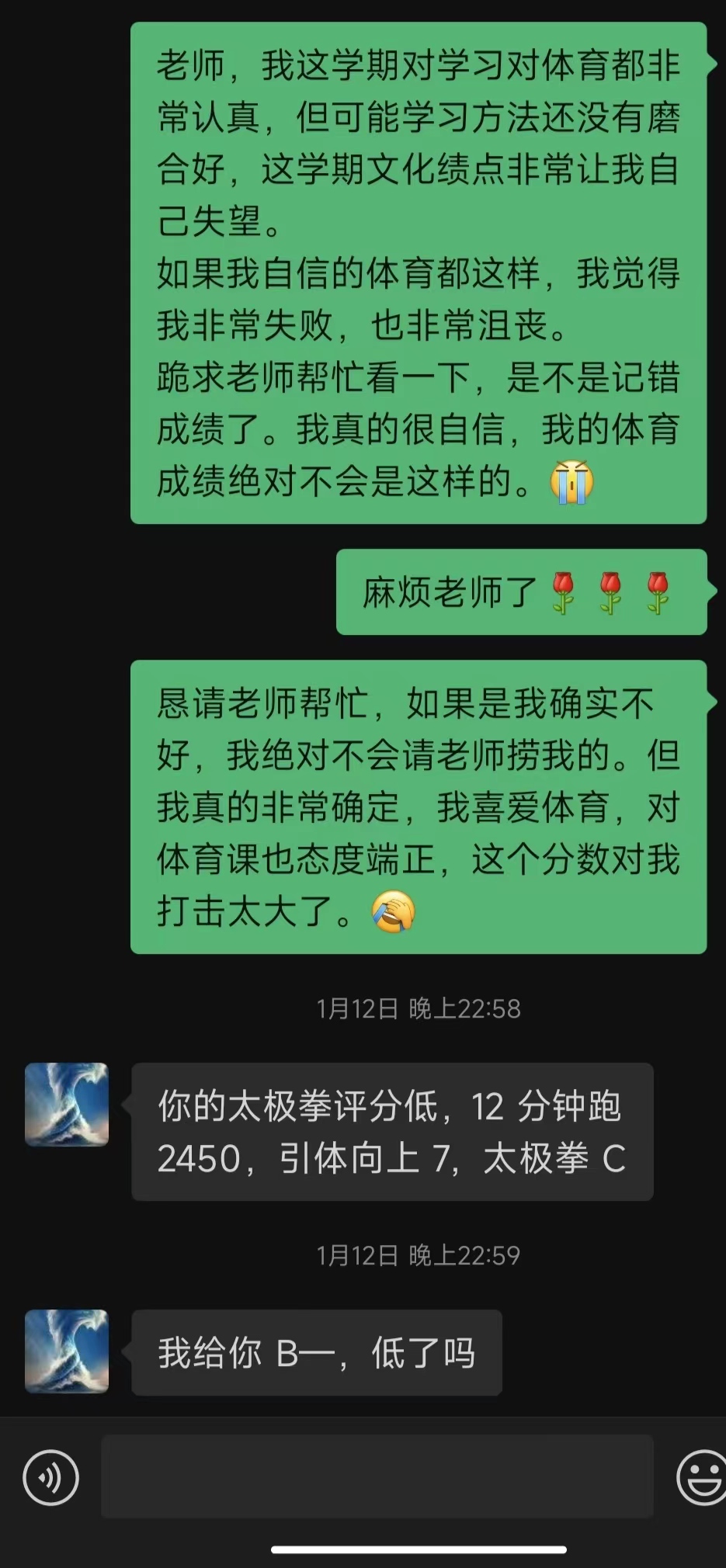 当晚就找杨老师理论,聊天记录截图都在下面。他一开始听了我的成绩之后,说的是“我们主要参考12分钟跑”,但是当我把我同学的成绩摆到他面前,他直接不回复了,隔了三个小时才回我,说我太极拳太差了,还反问我“是不是给低了?”。要不是怕影响到同学,我肯定会去教务处举报,并且把成绩都列出来,质问是不是给分有问题。