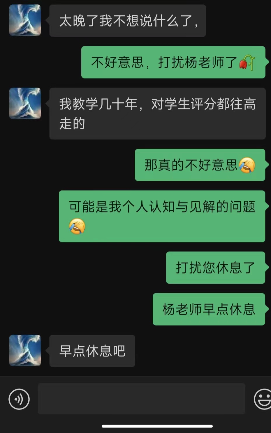 同学们的评分都是有理有据的,杨老师和别的老师评分差距那么大不是没有理由的。