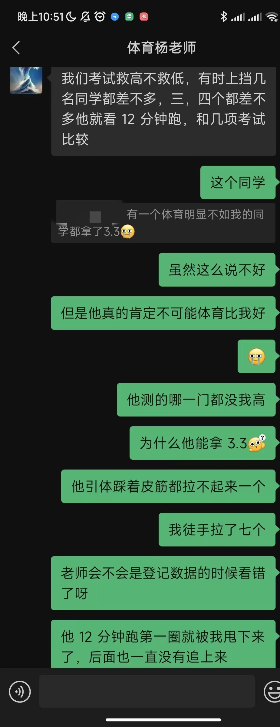 先是把我引体9个看成0个,在我问了之后还要反复强调我其实没占到便宜(可是二十几个人的班拉十个以上的人也就四五个),说来说去甚至不愿意改一下分,还搁这各种解释,我说实话你这一学分也不会影响我gpa但是你真的恶心到我了😅