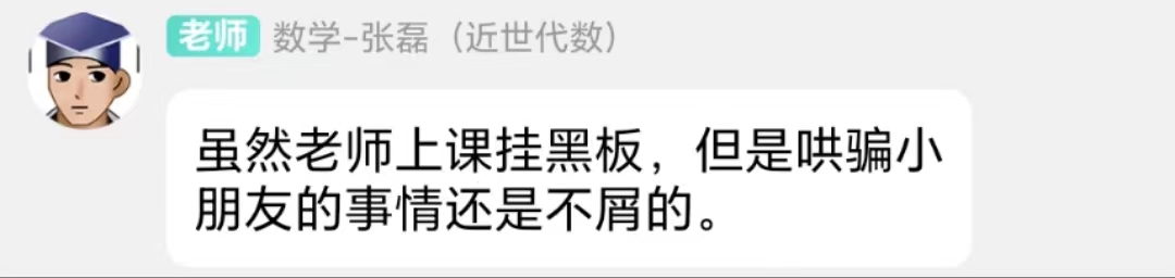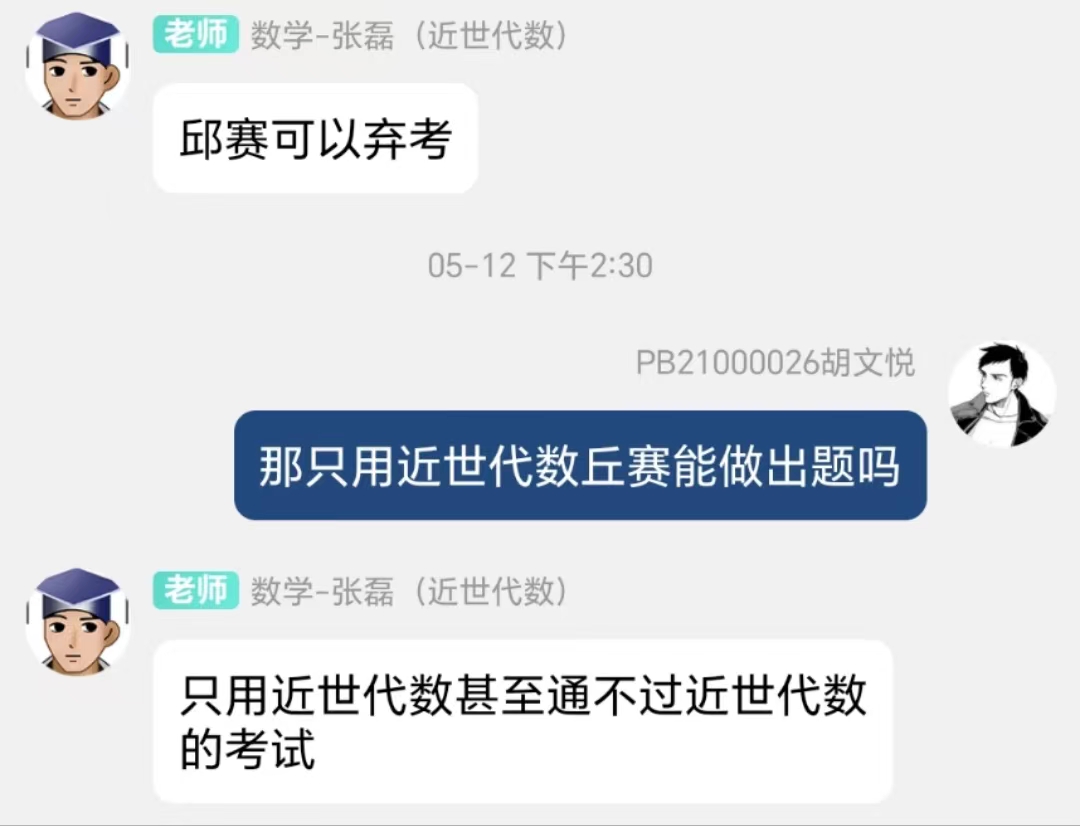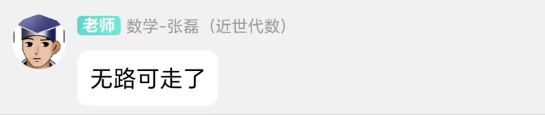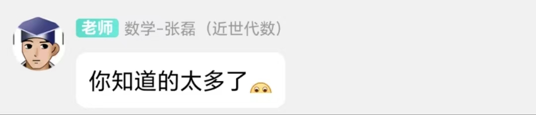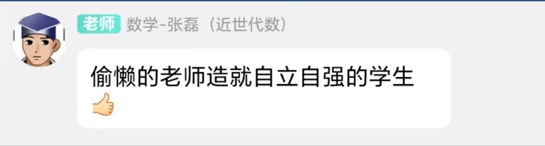不得不说张老师讲课确实做到了在保留基本知识框架的前提下把课程内容讲的平易、好懂,我个人的感觉是张老师一方面确实只保留了主要框架和对于过于抽象的概念的理解,过于详细的证明都是“接受即可”(确实近世代数里有很多事情看着显然证起来却很细很严格,点名内外直积、商群的各种运算等),另一方面则是证明时脚步放缓、询问反馈。听说老师习惯现场证定理,也因此造就特色挂黑板,可能无形中给了听课人一遍跟上的机会(srds,第一节课选择公理挂了小半节课还是有点男蚌,好像那个细节真把老师干傻了hhh)
