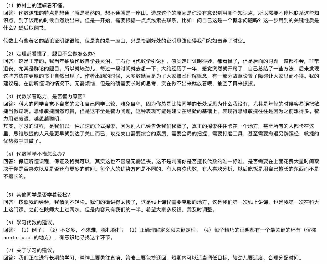 当然解决这个问题的方法就是多了解一些具体的例子,从例子出发理解每一个定义和命题才能感到其合理之处,并且有直观的感受,而不会觉得这些概念抽象需要死记硬背。(例如一开始学群论可能会觉得是抽象的数学小游戏,但其实在其他数学领域甚至物理中会发现群论最重要的部分是群作用,或者说对称性的刻画,在这之中正规子群,共轭等概念就会有比较具象的理解)因此张老师的课上也讲了不少书上没有的例子和相关计算,我习题课也试图补充了一些(讲了一些用群作用定义商空间的例子,多项式环的几何观点之类的)