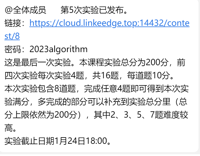 作业不算多,平均每周3-4题。都是书上原题,参考https://walkccc.me/CLRS/和其他博客即可。实验比较多,每次四题左右,一共布置了5次。平均没布置一次都要花上一个周末时间去写。除了流网络的实验(暗示),其他题都不太好搜,建议自己写,也算是加深对书本知识的印象了。不会就问助教,用c++, 调stl都行,AC没那么难。