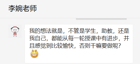 开课的一个很大的目的其实是吸引学生来化院学习,虽然我觉得其实大家选化原A还是化原B就已经很decisive了。老师曾经说过:“你要想象学生当中可能有人最终能够投身化学,成为比你我还厉害的佼佼者,就好比他们数理基础比一般的化院学生强劲,如果能够被我们收到3系说不定就能在理论化学方向有所建树;从这个角度来说,要尊重他们、佩服他们。我是在科研领域觉得当年受过很多挫折,对科研没有信心,而是对教学有很大的兴趣;我理解的教育就是一棵树摇动另一棵树的过程,今年在选助教的时候选择你的一个原因也是因为我觉得你是竞赛生,有那种对于化学的热情和兴趣,我希望你在这个过程中能够打动学生,吸引他们投身化学行业,比如说在教学之外和他们聊聊自己在科研中的事情,能够让他们觉得化学是一个能够收获兴趣和快乐的学科。”当然我没有那么优秀,没有老师预期中那么好23333333333,十分惭愧,可能唯一做的稍好一点的是自己也是学生可以更多地感同身受吧。课程几将结束的时候也评价我说:“相比我之前3年的助教,你应该是因为本科生的身份,是我这么几届助教里和学生关系最好的一个。我觉得你相比研究生助教对化学更有热情,化学功底更扎实,并且因为本科生的身份和学生有更多的共同话题。”谢谢老师的夸赞。