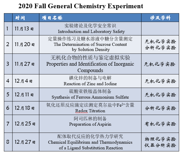 课程难度:本课程采用Wisconsin原版实验教材,在主讲老师李婉的修改下形成课程的大部分实验内容并定稿成实验讲义,在绪论课(第一节课)时发给大家。难度定标在本科生化学普及入门的水平,重点在于让学生领会化学实验的大致流程,涵盖无机、有机、分析、物化、仪分多个部分。重心更多地放在让学生感受化学的魅力而不是刻板地强调实验流程和操作的严谨和正确性,激发学生对于化学学科的兴趣,试图以友好的姿态吸引一些少院的学生投身化学的学习(老师原话)。课程内容如下(Semester:2020FA)