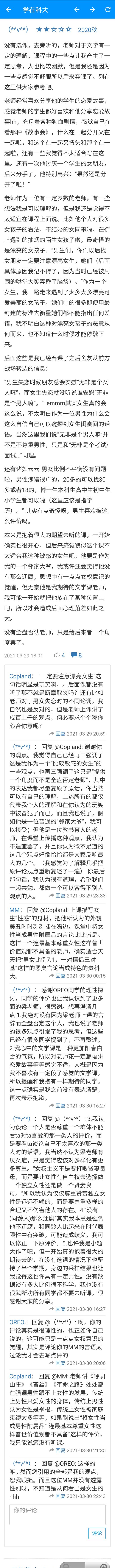 ”再解释一下我之前打低分的原因,为了不被骂干脆引用对方辩友的原话,感谢这位同学我真的觉得我们观点很相似,’课程群里有人建议这门课改名为‘大学生恋爱课‘,这是有道理的,因为梁老师上课时讲的最多的部分就是’我在复旦的时候,有一个学生……’然后就开始讲起了学生甲和学生乙的恋爱故事。’ ‘但,这是文学课。课程的主题在于对文学著作的解读,而恋爱故事最多算是调剂品。’
