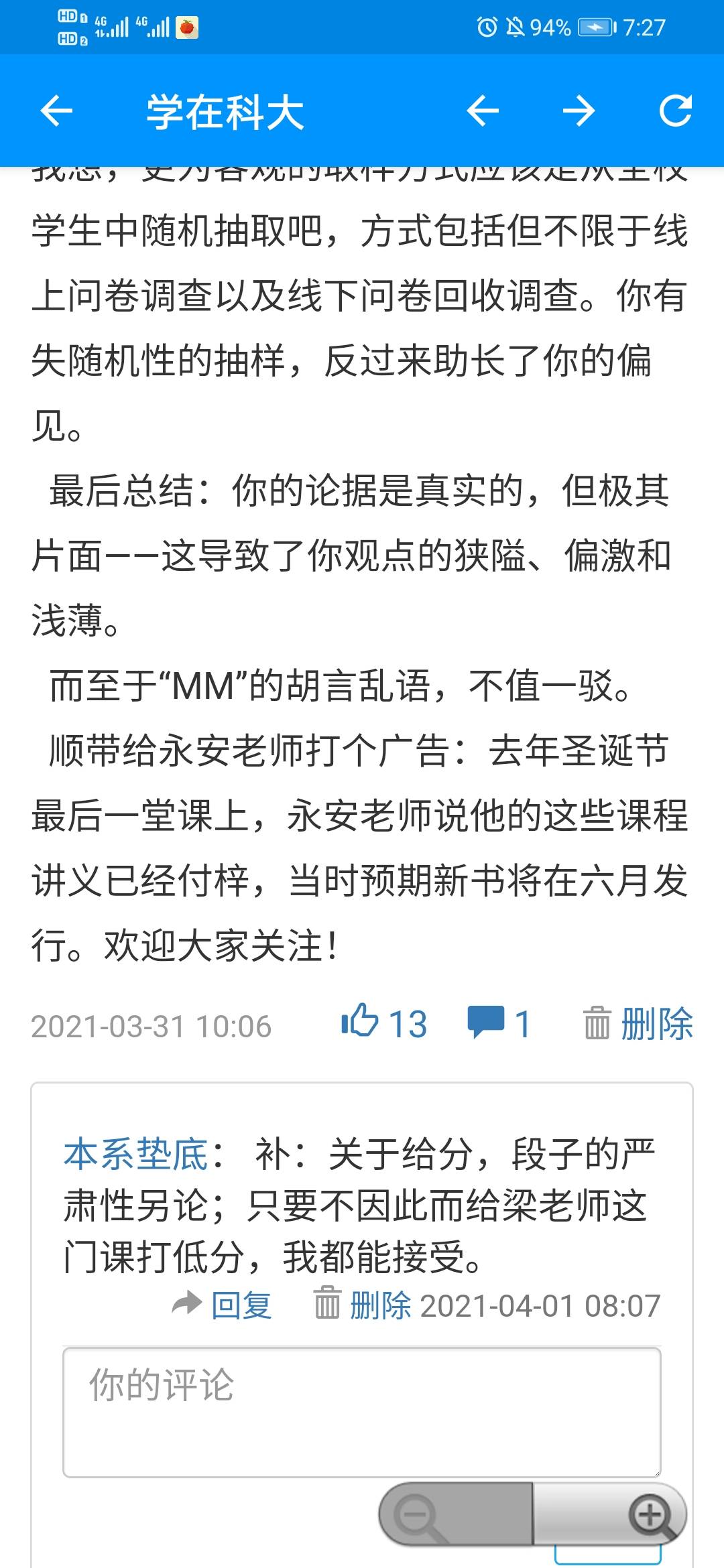 当然,永安老师的聊天部分不可能完全合人心意。事实上永安老师自己在第一节课上就说过:”你们不要认同我说的每一句话——我说的很有可能你们会保留,甚至是反对,这些都是很正常的,说明你们在思考。“类似的言论,他也不止一次在课上提及。比如他举过的一个例子:FDU一个女同学曾经在一门课上当堂说:”老师,我认为你所讲的很多都错了!“然后洋洋洒洒讲了大段时间。最后,她在这门课上拿了次满分(类比到科大就是4.0左右)。