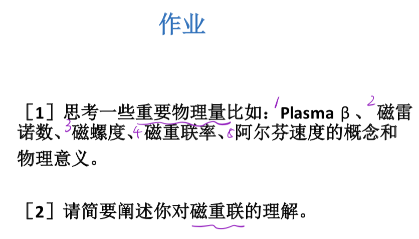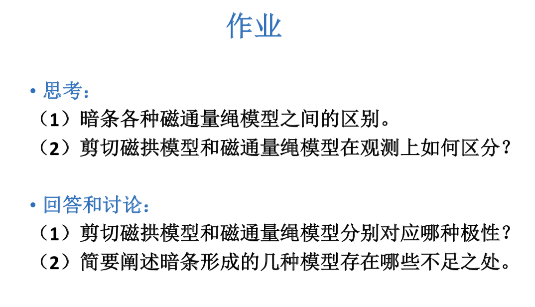 4. 宿英娜老师也在12月授课两次,分别是关于暗条/日珥和耀斑,包括但不限于其结构、爆发、稳定模型等,课程中讲得比较快且基础,课后作业需要对以上内容及磁重联进行概括介绍(如下图所示),基本需要阅读几篇文献/书籍进行总结的,我觉得是十分好的作业。