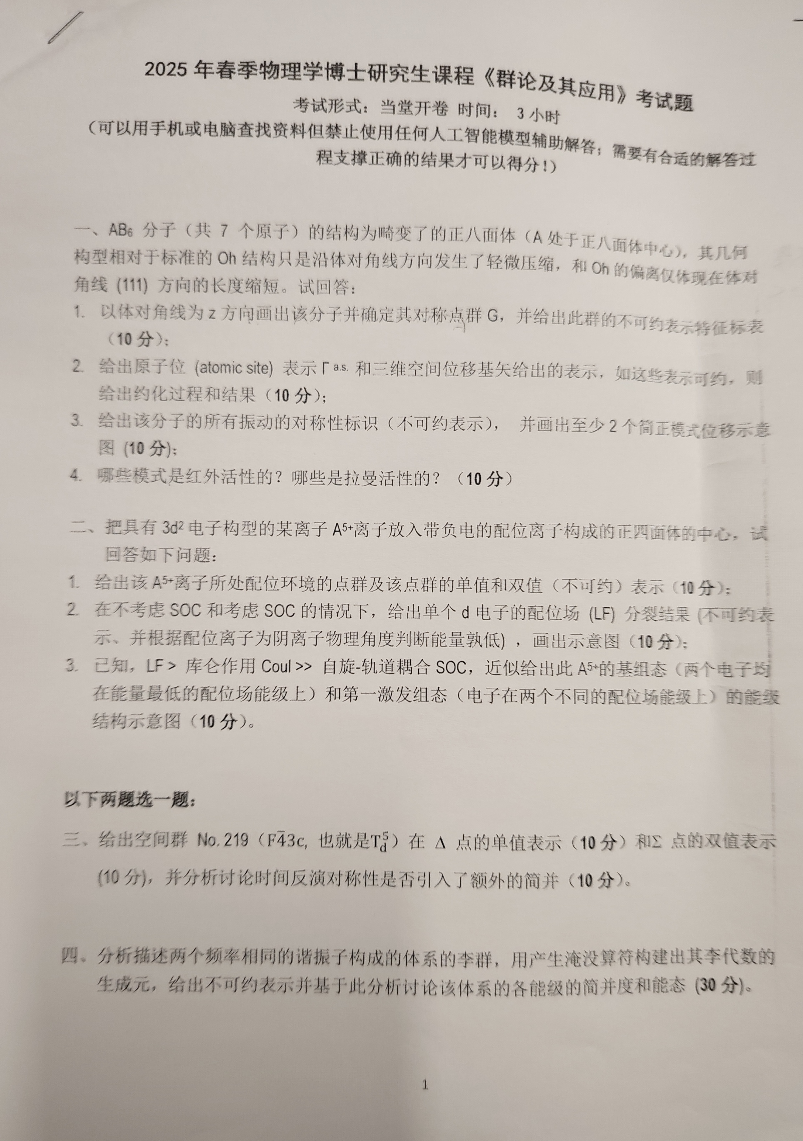 4.“试做2024往年卷,感觉老师出的题目除了和他做的光谱学相关的方面以外,质量很差;例如有写出P(4)置换群的所有非平庸子群这种毫无意义的题目,不知道老师本人是如何处理这种没有通解,只能自己硬凑的题目,我是不知道在数学和物理应用中,写出一个24阶群的所有非平庸子群有什么用”。P(4)同构于Td点群,而点群的母子群关系是相变过程中晶体结构对称性改变的依据。这种关系不但本身有用,而且是空间群母子群关系的基础。比如,问一个立方体(Oh对称性)沿体对角线(即(111)方向)拉伸或压缩后得到分子具有何种对称性?这正是今年考试第一大题的第一问,去年的题更简单但也更繁琐,却并非不重要。