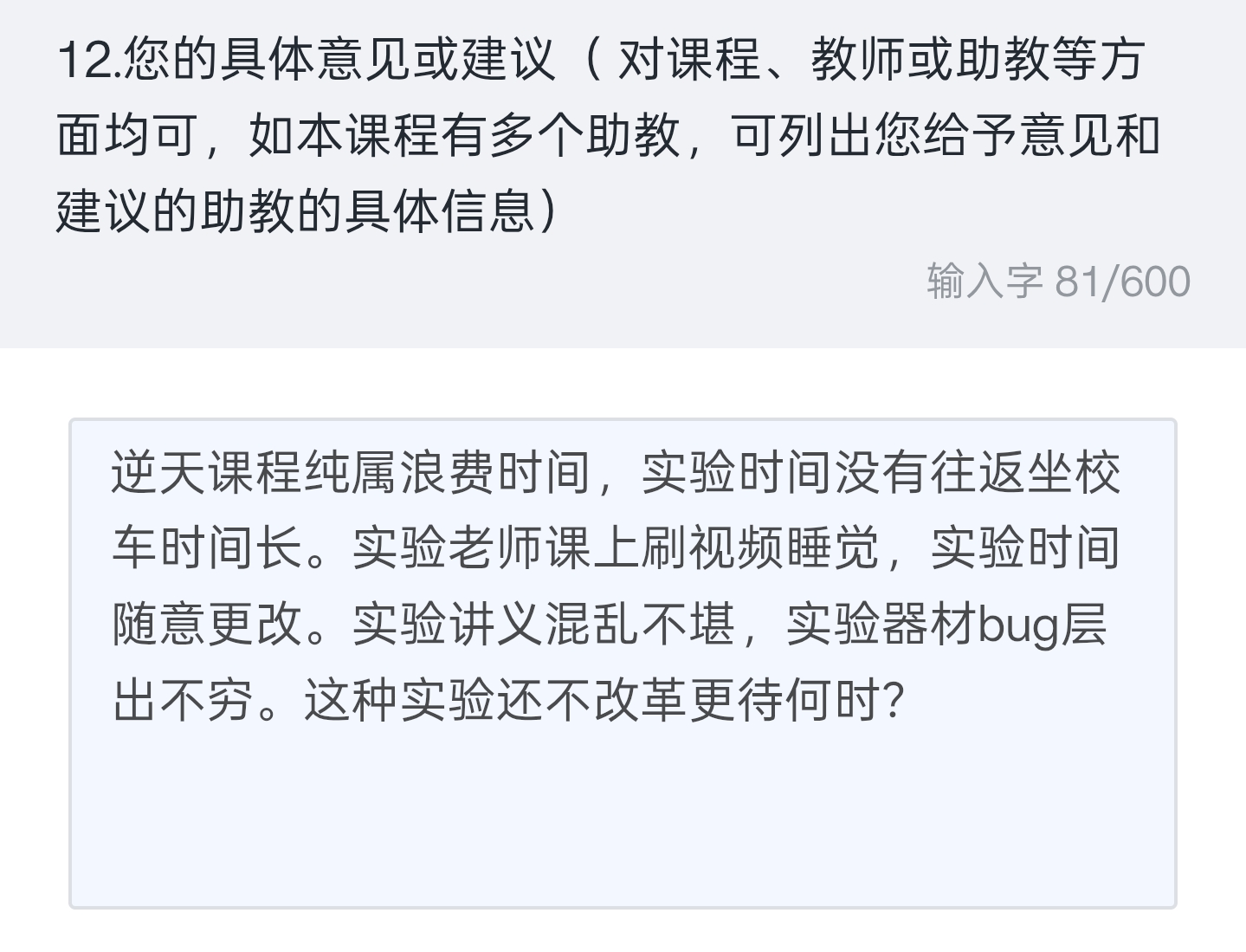 实验时间安排混乱,占着我周五的课表让我选不了别的课,具体的实验时间要自己选。每周要回西区做实验,节假日放掉的课日后要单独找时间补,想没想到选周六的学生要有三周,周六日都要赶回西区做实验呢,这个实验能按排到周六本来就很离谱了好不好。实验讲义不清楚,一个课给三个手册,老师上课不用心,我真是没招了。现代控制理论之下最无语的一门课…