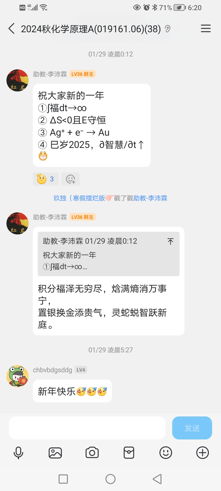 洪勋老师的课如果不听,危害没有吴老师大,但是有影响。洪老师喜欢讲历史故事,比如电子的发现,出成了期末考题。其他的题只要(1)学过化竞或(2)认真听课,都非常简单,包括本来最令人头疼的速率方程推导(比作为作业的HBr生成机理简单多了)。期末卷面不知道(不给问),总评96。