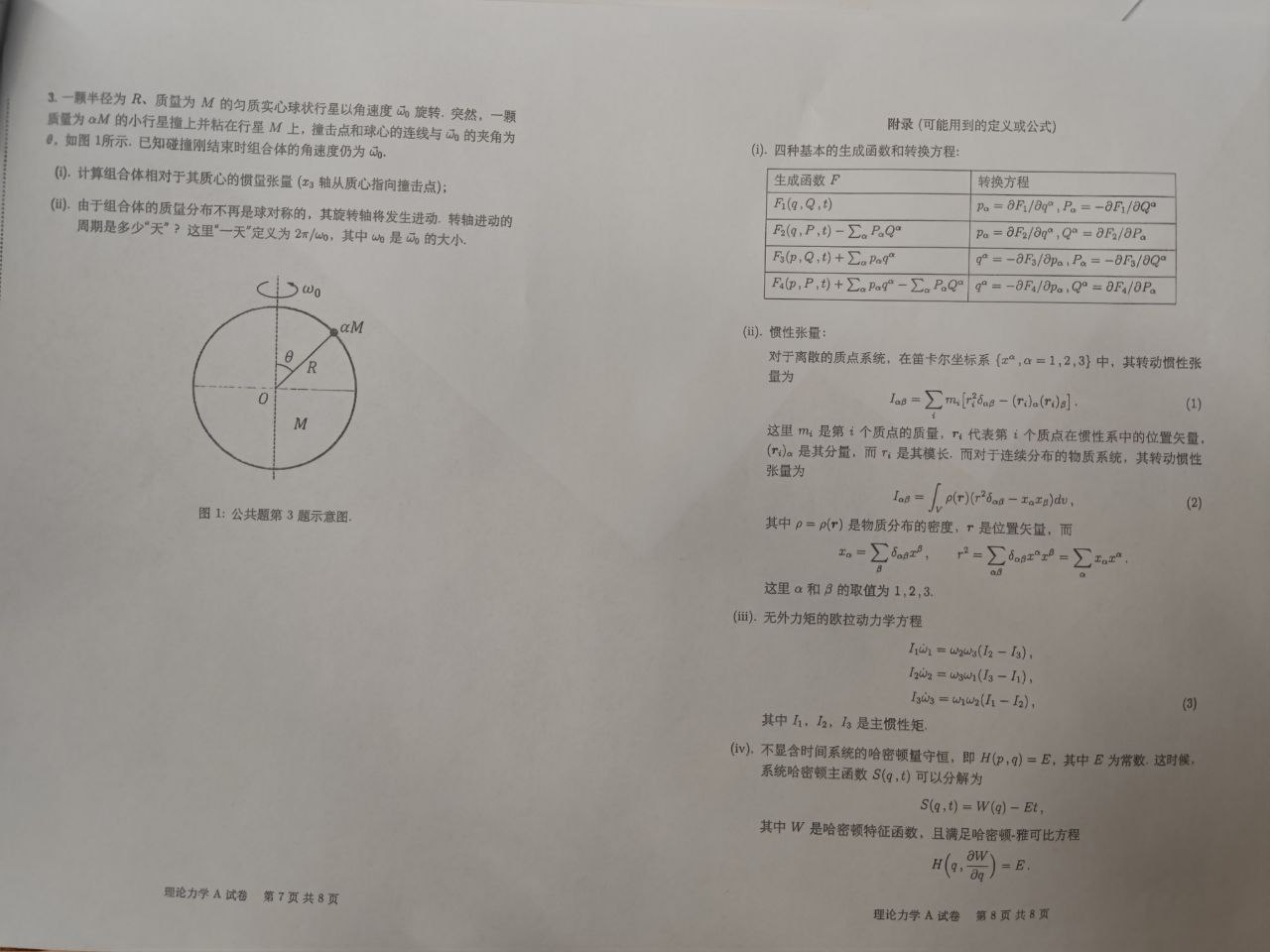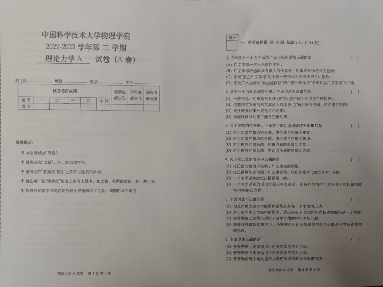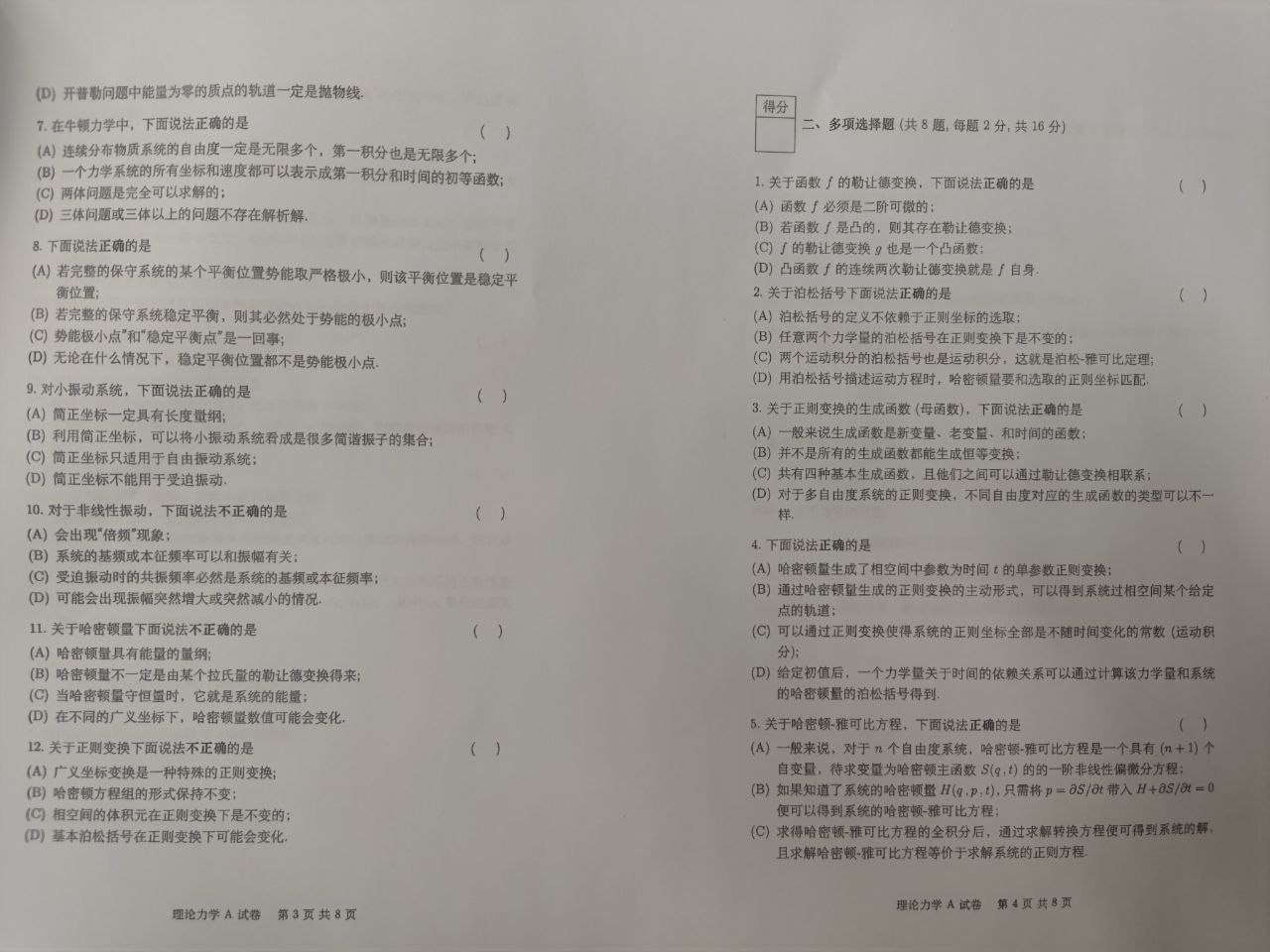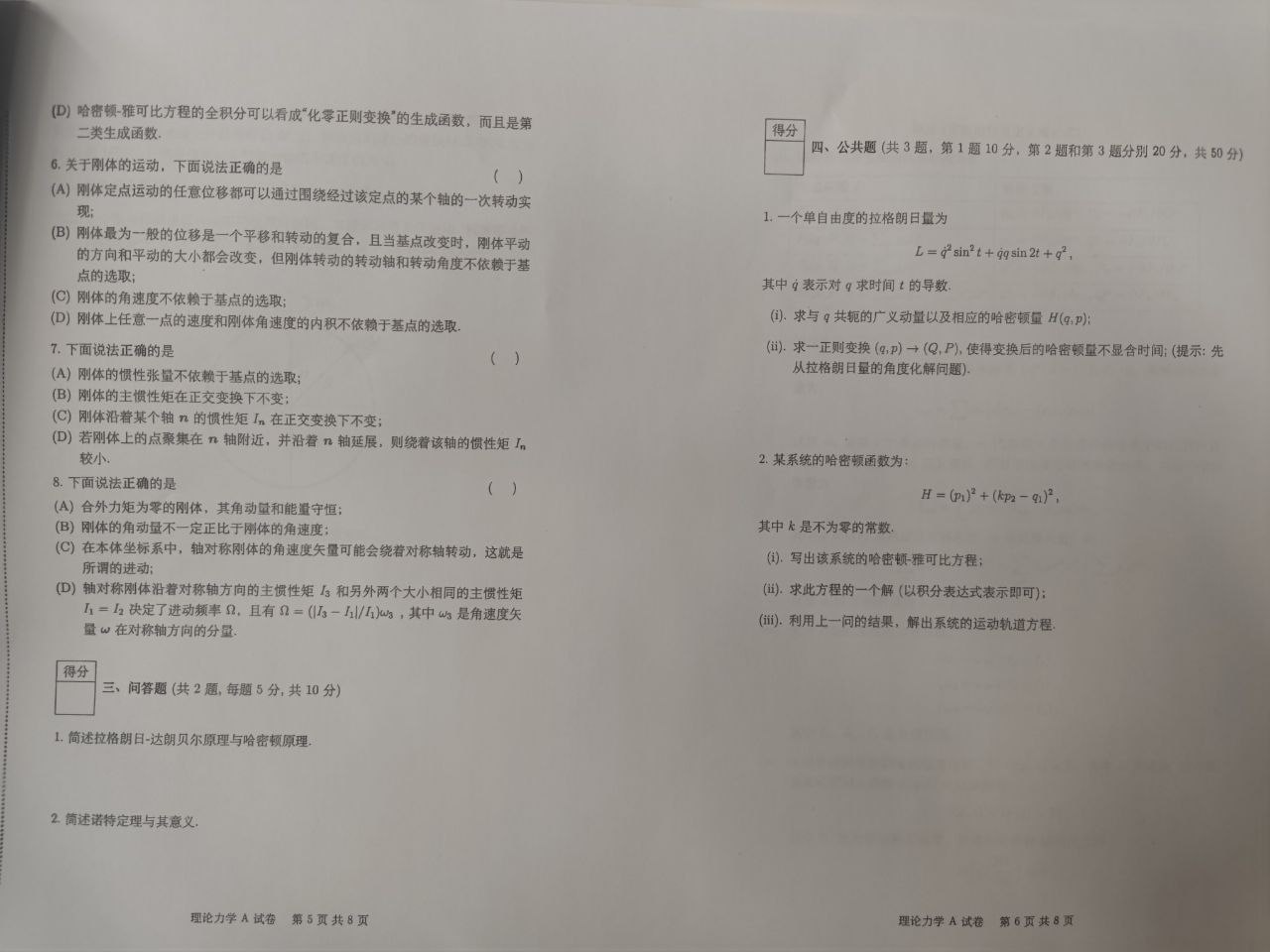 题型分布具体为15单选,5多选,2简答和3公共大题,简答题一个是考哈密顿原理一个是诺特定理,大题是正则变换计算生成函数和哈密顿量;取朗道规范磁场中带电粒子HJ方程的求解和拉格朗日陀螺。具体来说都是一些公式的简单应用,作业题基本上都能涉及的到,曹老师上课也暗示大家多看看拉格朗日陀螺。