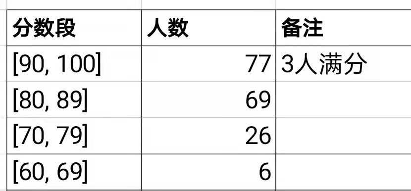课程的考核方式也很简单,包括平时成绩(作业)+ 闭卷考试。这二者的比例不定,可能四六开,可能五五开,据杨老师说最终目标是最大化所有同学的平均分。本学期的比例是平时成绩40%,期末考试60%。2020秋和2021春,本课程的平均分都是86分,附2020秋本课程成绩分布表(选课人数180人,2人缺考):