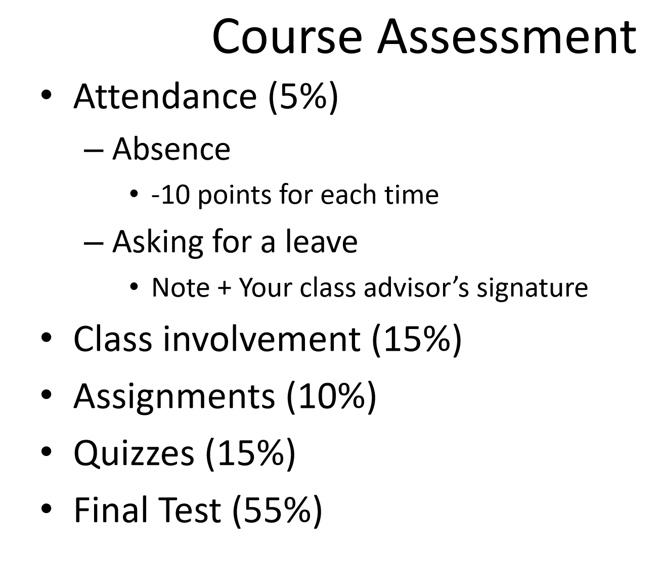 给分:签到5%,课堂参与40%,课堂任务(一般是写个Summary)10%,quiz15%,期末55%