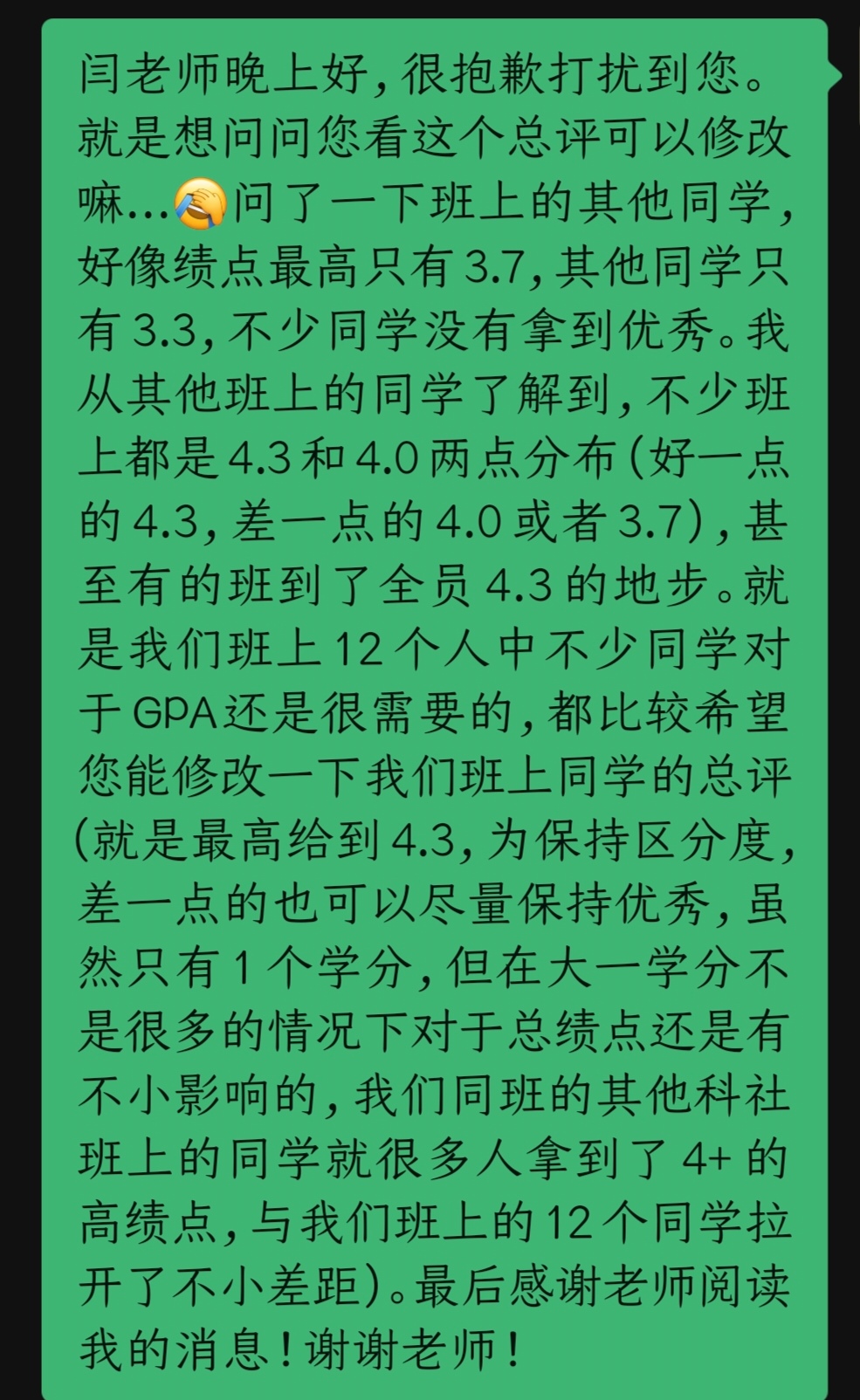 我寻思着这一段话应该也没啥不客气的地方吧,想让您从3.7/3.3两点给分变成4.3 / 4.0两点给分,这样子既能展现您心目中的“区分度”,也能最大化利好我们12个人的成绩,就算要不回来,给我们个说法,要是真的我们这个班做的最好的人就还是比其他全员4+的班上的同学烂的多,才只给了3.7或3.3,那也认了,然后他怎么回的呢?