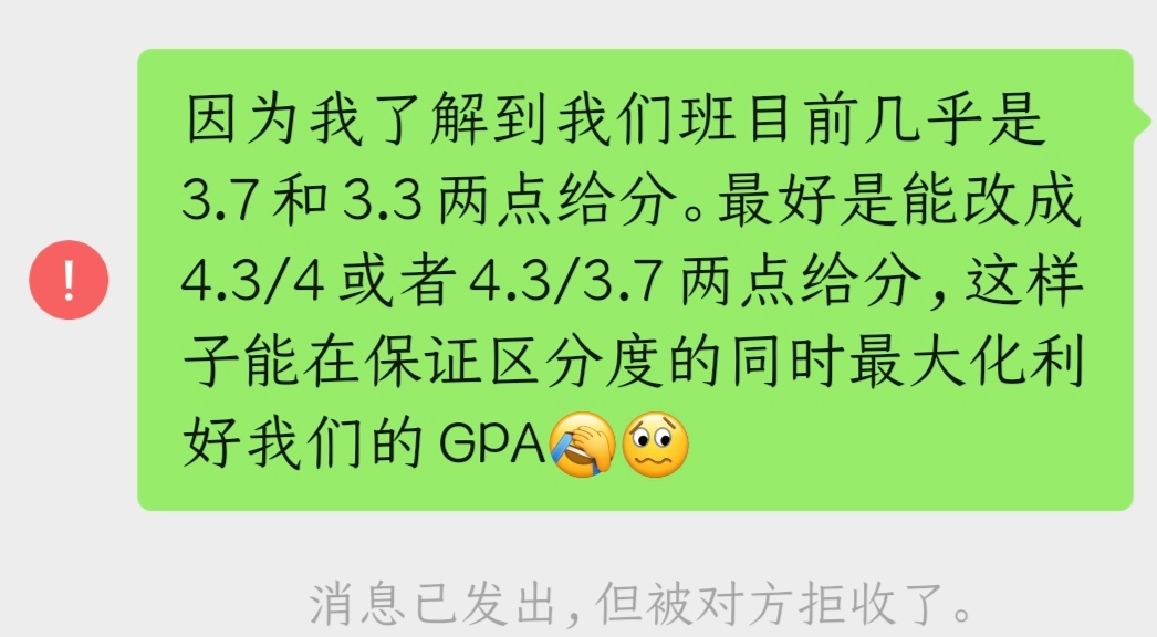 不是哥们,你tm是不仅两点给分,还tm是3.7和3.3两点给分?别说给满优秀率了,你tm连40%优秀率都tm没给到是吧。你tm喜欢两点给分那4.3,4.0两点给分不行吗,这和3.7,3.3给分与你而言难道不是一样吗,非要给人3.7,3.3两点给分还只有25%优秀率恶心人是吗?最逆天的是,昨天晚上我们统计了一下我们班同学的数据之后班上有同学向老师提出了如下修改成绩的请求: