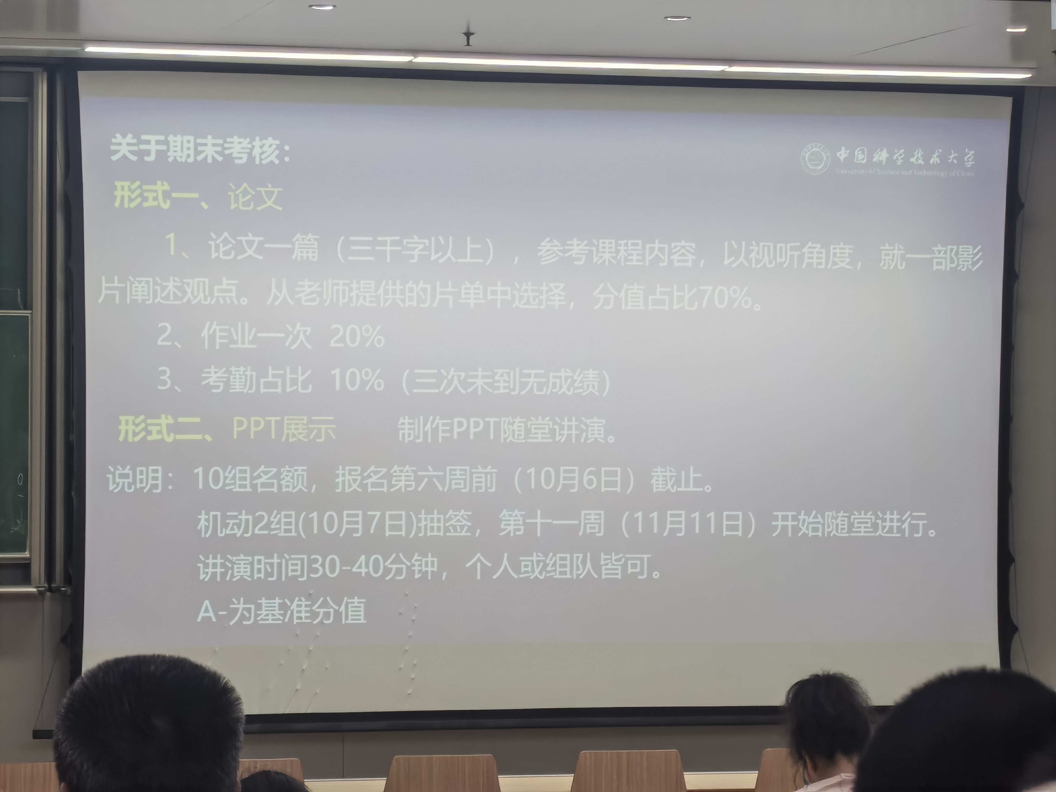 课堂:总体上乏善可陈,建议准备降噪耳机。老师讲解的时间并不多,其余时间以各种营销号视频为主(自己找切片和影评代替也差不多)。好处是课堂参与度、课堂作业貌似并不是A档的准入标准。这就意味着,即使这门课的课程内容就是垃圾,你也不会浪费课堂时间,大不了将其用作自习(这也是本课程仍然值及格分的原因)。由于存在考勤,建议尽量到课(可以迟到)或提前找理由请假。