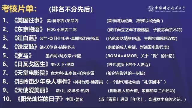 后面课上会放许多名片解读,但我感觉解读得挺好,我看过的电影也还想看。老师授课内容总体上比较有脉络,顺着ppt上的主题来的,所以一学期后回头我还能想起大概讲了些什么。