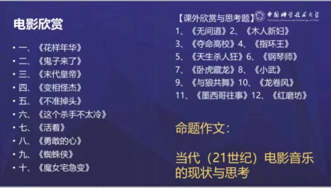 课程内容方面 如果是想系统接触过电影理论(如 场景调度 镜头语言)的朋友没必要来 因为他上课不讲 毕竟王老师是音乐专业毕业的 就他课上展示出的能力来说 不如导演专业毕业的本科生 (不过这门课叫电影音乐欣赏 偏正短语的话 大家自行抉择吧) 王老师前两节课会系统讲授一下音乐鉴赏技巧 但是就像高中阅读题技巧一样没啥用()后面就是电影欣赏课 蒽 我不好说 反正从红色音乐欣赏那一节课之后就没听过了……
