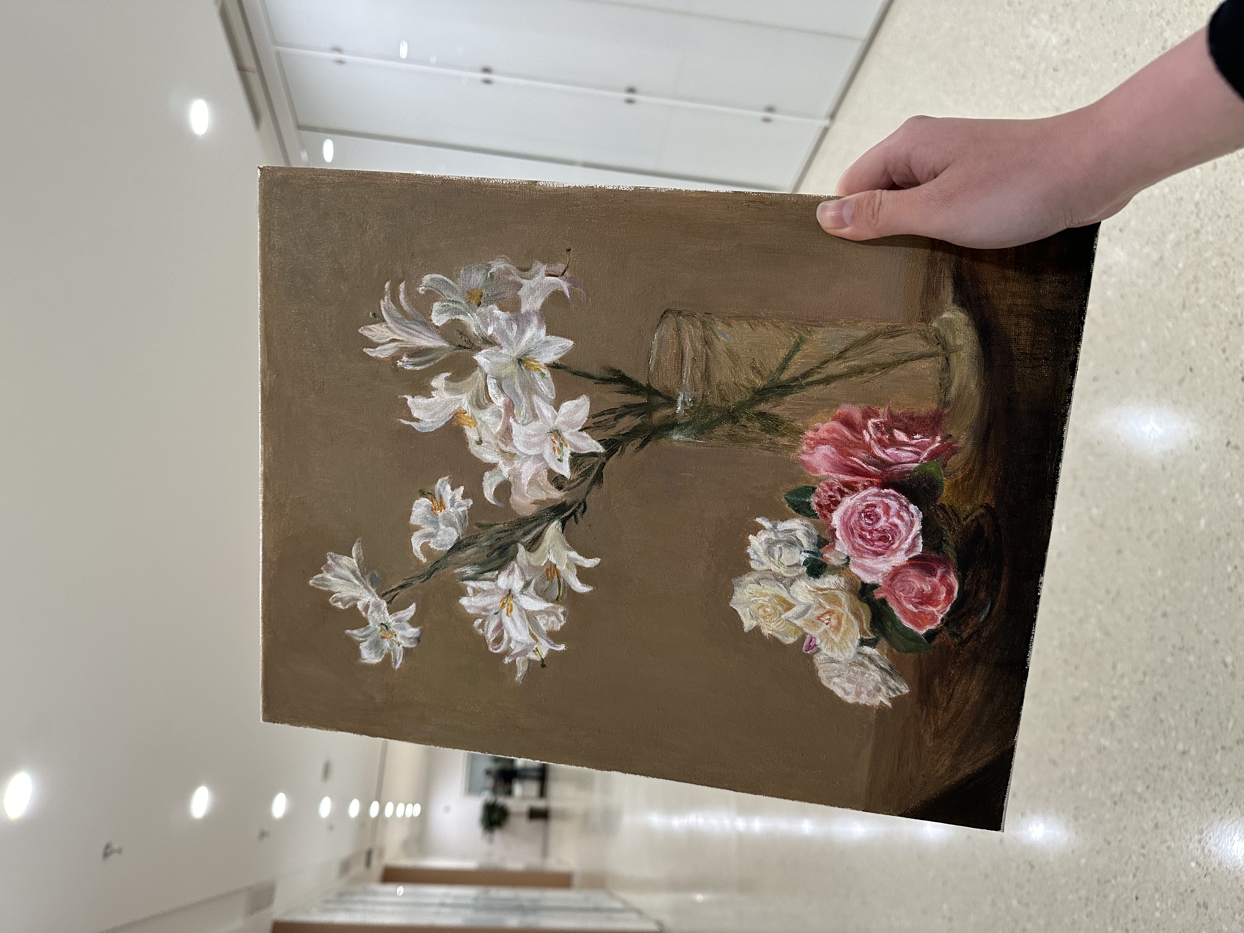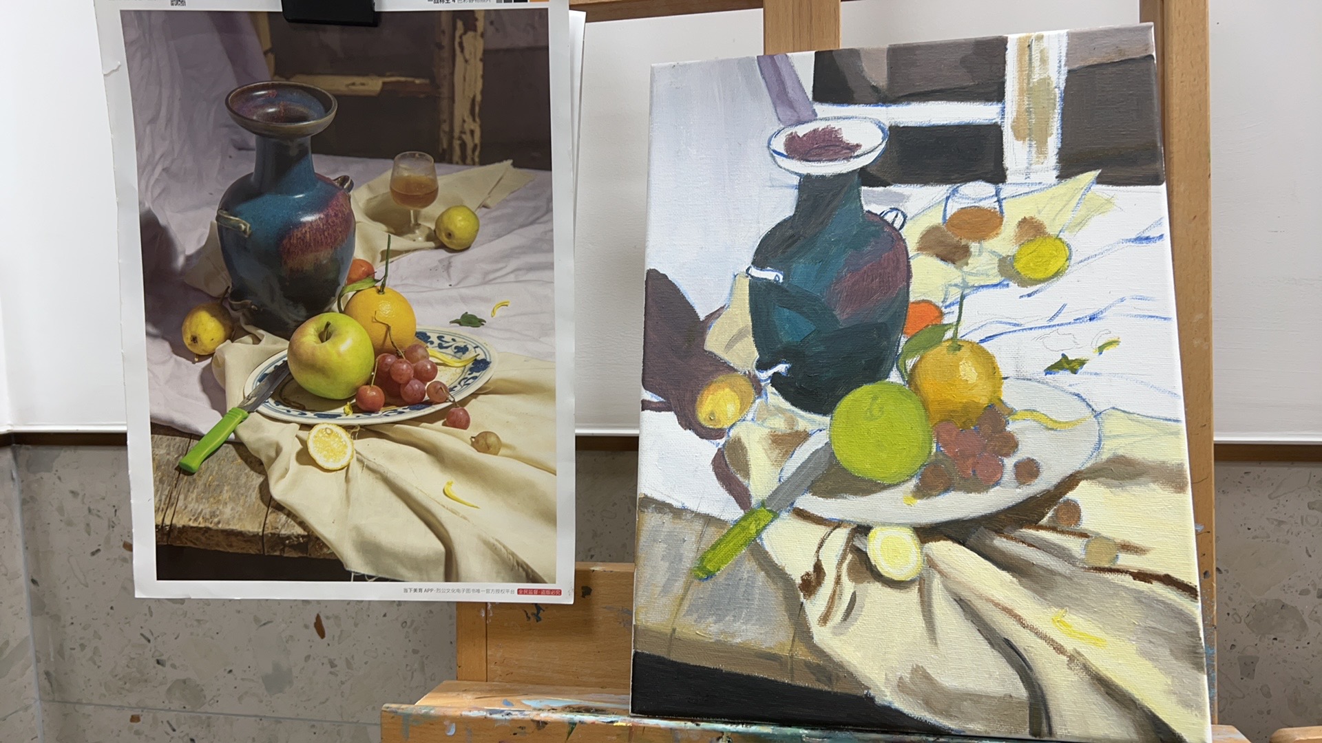 一个学期的安排大概是两幅临摹大师作品+一幅期末考照片写生,内容都是按自己喜欢的选(期末要求好像是画的照片含有6个物体就行,可以自由组合,一般老师会建议画简单的罐子水果就好(我想画花哈哈哈哈毕竟在能力范围内就选了张有一束多头玫瑰的画))平时周末/现代艺术中心有展览的时候画室都会开放,想多画点/赶进度/喜欢画的都可以去