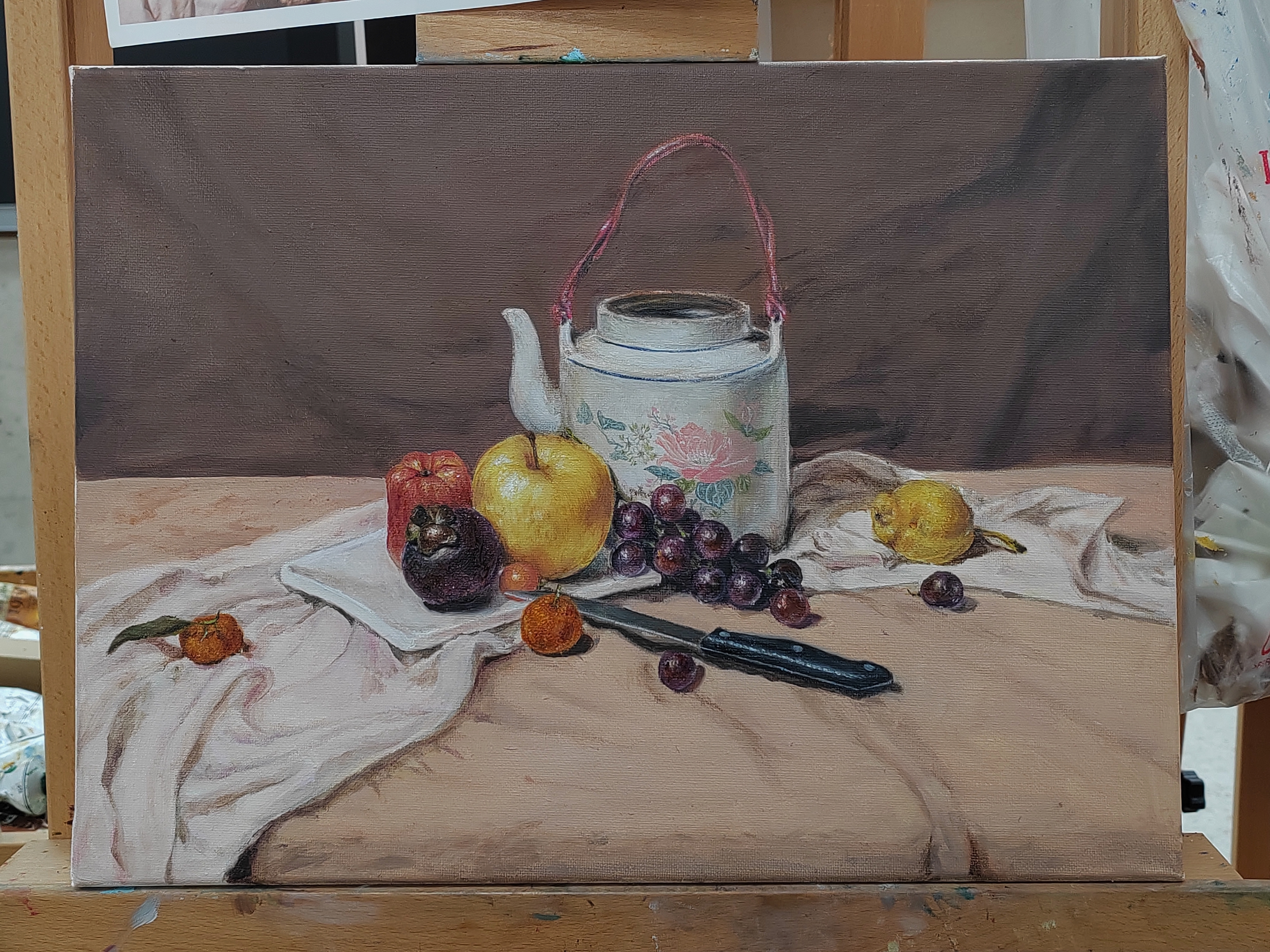 不过你给我的感觉是,你好像不是很会调颜色。因为水果作为固有色纯度较高的物体,你在调它们的暗部的时候,似乎只加了象牙黑(我看着像,不知道是不是),所以水果看着很脏,而且冷暖没有一点体现,也没有环境色。