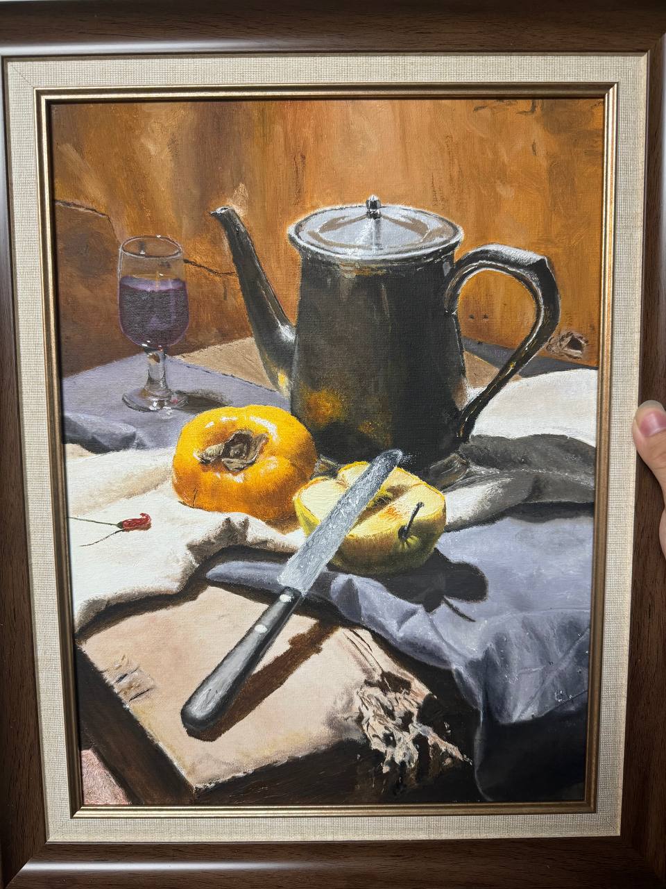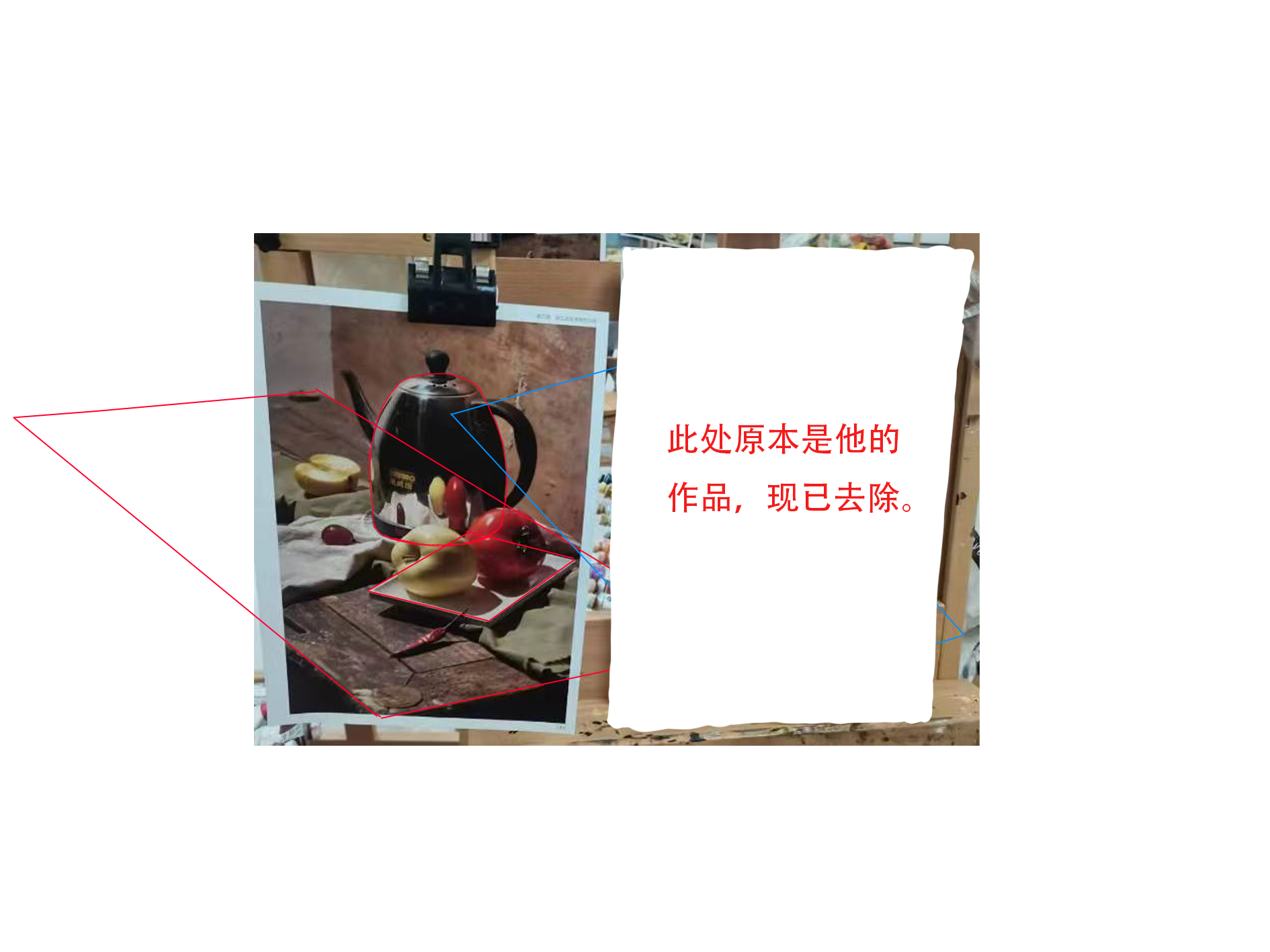 最后,就是我前面列举的那几个大的方面。这也没什么好说的,就是那副作品没出那么多错误,各方面都做得比你好,空间明暗色彩冷暖关系都有,可能唯一不如你的地方就是衬布。