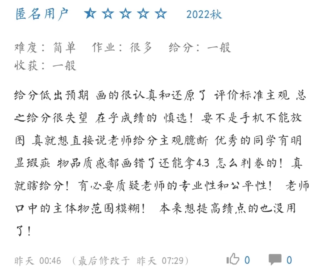 那个匿名打低分的,“给分低出预期”指3.3是吧。一个两学分还肝的画画课指望拿来提绩点,你不如拿这时间卷你那专业课呢,不会是卷不动专业课就指望拿选修课投机取巧提绩点吧。没挤进优秀率就直接给半星污蔑造谣老师,卷不过就破防差不多得了。