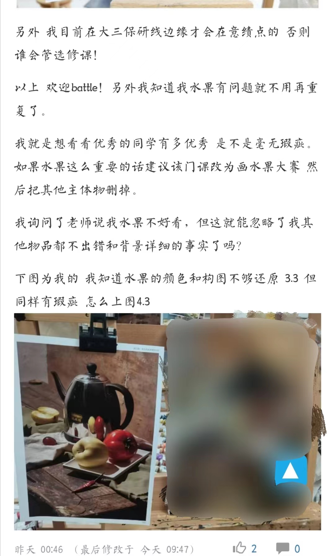 本来想自证来着,但是过了几天之后完全感觉不到自证的必要。本来也就没有什么人关心我的动机,这跟这条点评也没什么关系。而且我已经写得足够冗长了,所以就到此为止吧。至于这件事里与课程和绘画本身无关的部分,尽管槽点很多,但评课社区毕竟不是吐槽社区。