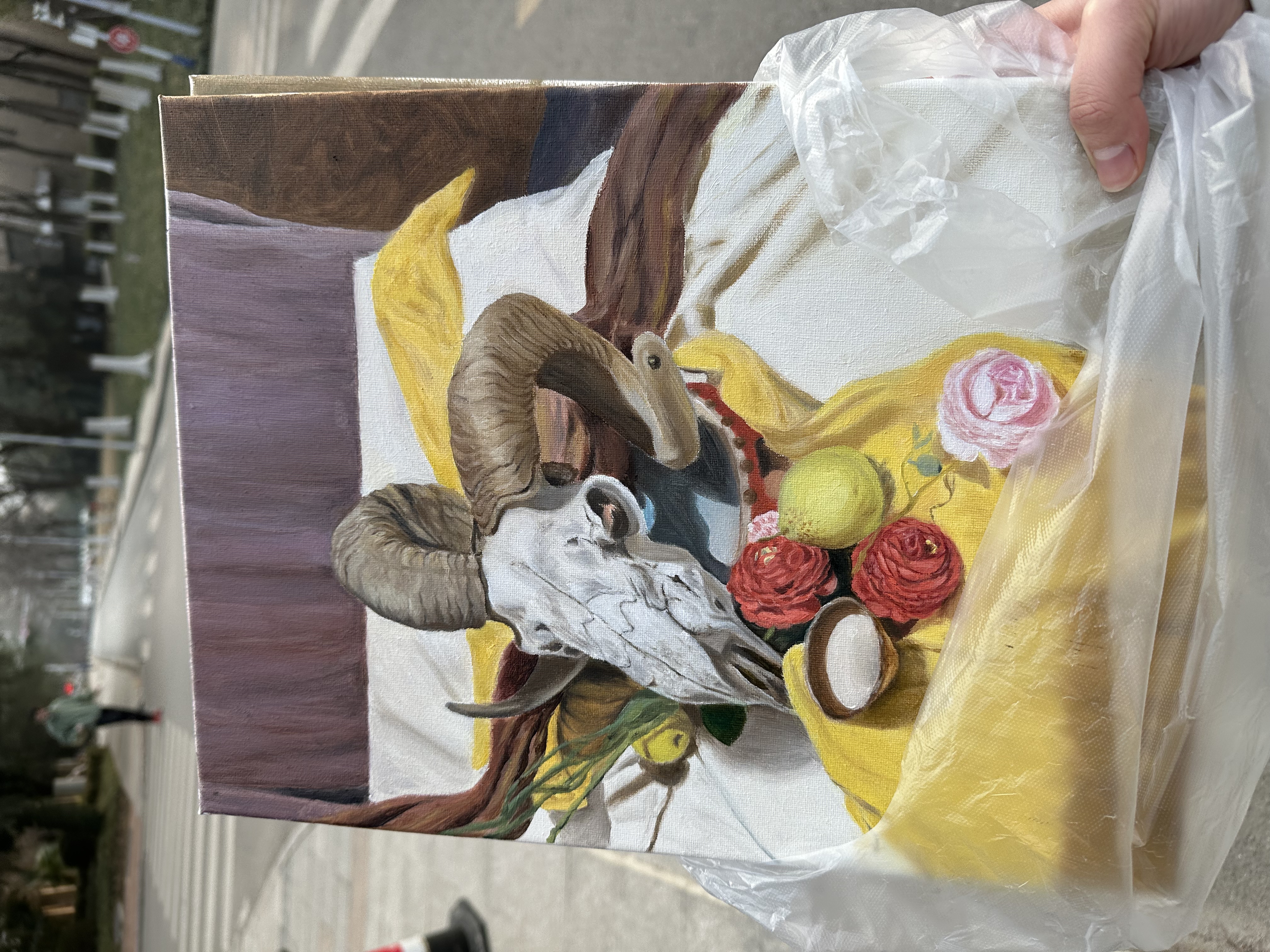 期末画照片,是自选(我以简单为标准选的…躺了)。个人画了很久,最后要交的那段时间刚好差不多都结课了然后就去爆肝了俩下午抠细节。我主体物画小了(老师让我改大但我不知如何下手…),所以只能把前面的衬布画得很细…照片大多数是白色,有点空,又得在画里变成五彩斑斓的白。画完转了一圈,感觉自己的风格和大家比较迥异。大佬的画很有油画质感的美,我的画就像廉价打印机打出的照片(救命…)。花了心血的这幅画老师和同学给了优秀,非常感谢!