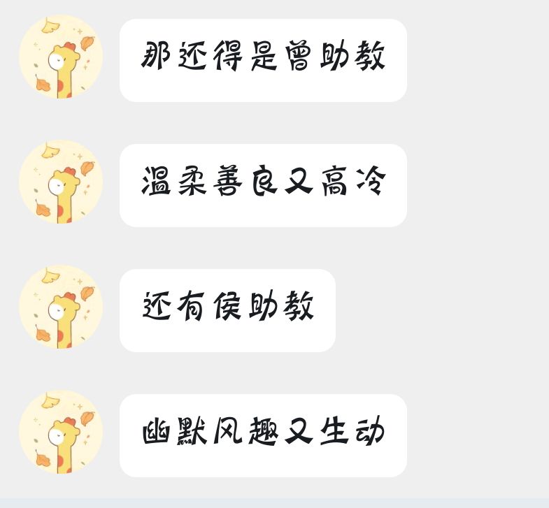 22秋和23春的助教似乎都是老师的博士生,水平很高,且回复都较为及时积极,非常好评,尤其是“一条懒狗”(QQ昵称)曾助教,平时也和大家一起睡裙,非常亲切。(手动狗头)