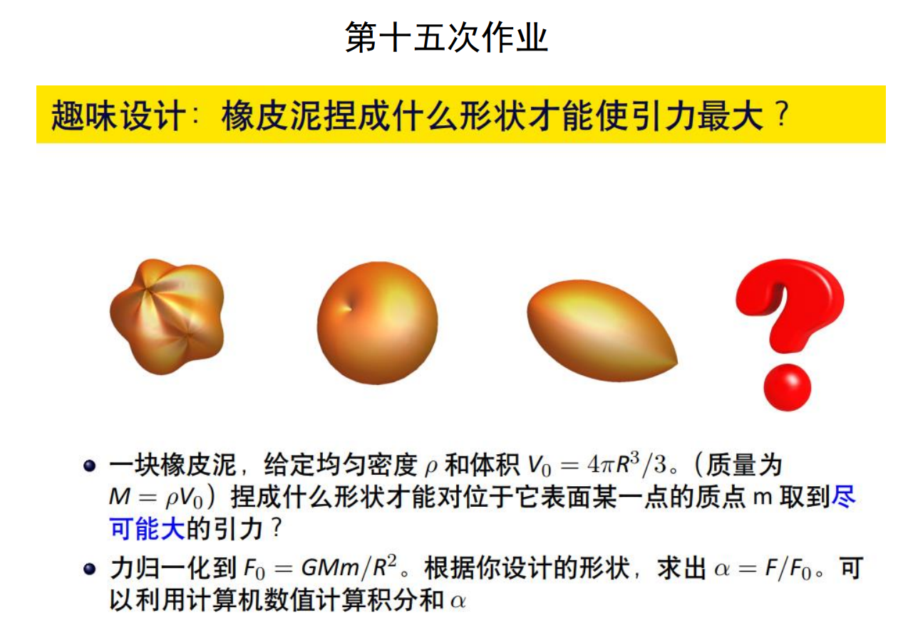 让我印象最深的题目是,给我一团橡皮泥,让我捏成自己喜欢的形状,使得它对表面一点的引力尽可能大。助教还会根据每个人引力的大小,以及大家都认真程度,进行评奖和发小礼品。