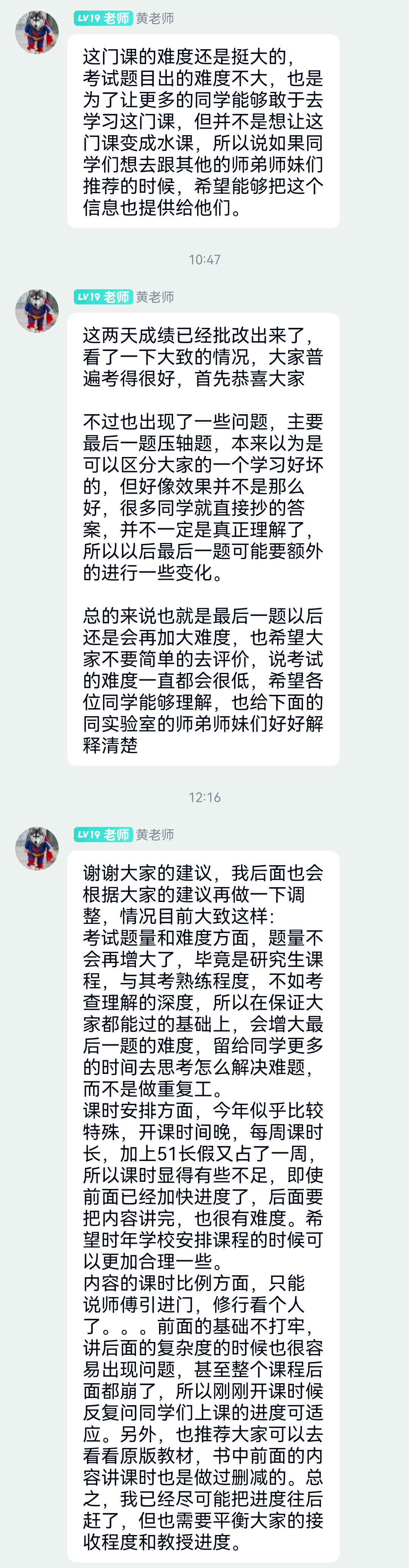 这学期5月15日考完试,5月18日就出分了,效率很高。出分后,黄老师在课程群里进行了一些总结并对这门课后续可能的调整做了展望,经过黄老师同意分享到这里(因为黄老师不希望后面选课的同学误以为这是一门水课):