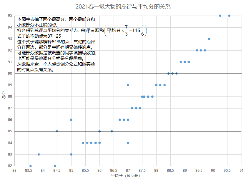 主要目的是调查总评得分与平均分的关系。删除的“小数部分不对”,是指根据实验安排,每个人应该会做6~7组实验,算上一次调查问卷的满分后,小数部分应该属于一个整数除以7或8的小数部分。不符合以上要求的得分则舍弃为无效数据。统计结果如下: