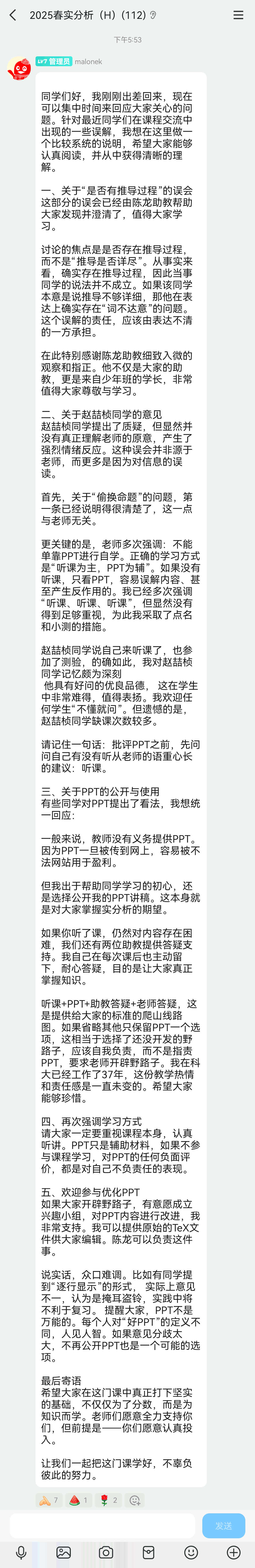 25 秋补评:看到这学期有23级学生反馈任✌🏻数学分析A1用板书不用ppt讲课进度过慢,感觉任✌🏻可能要无语了🤣