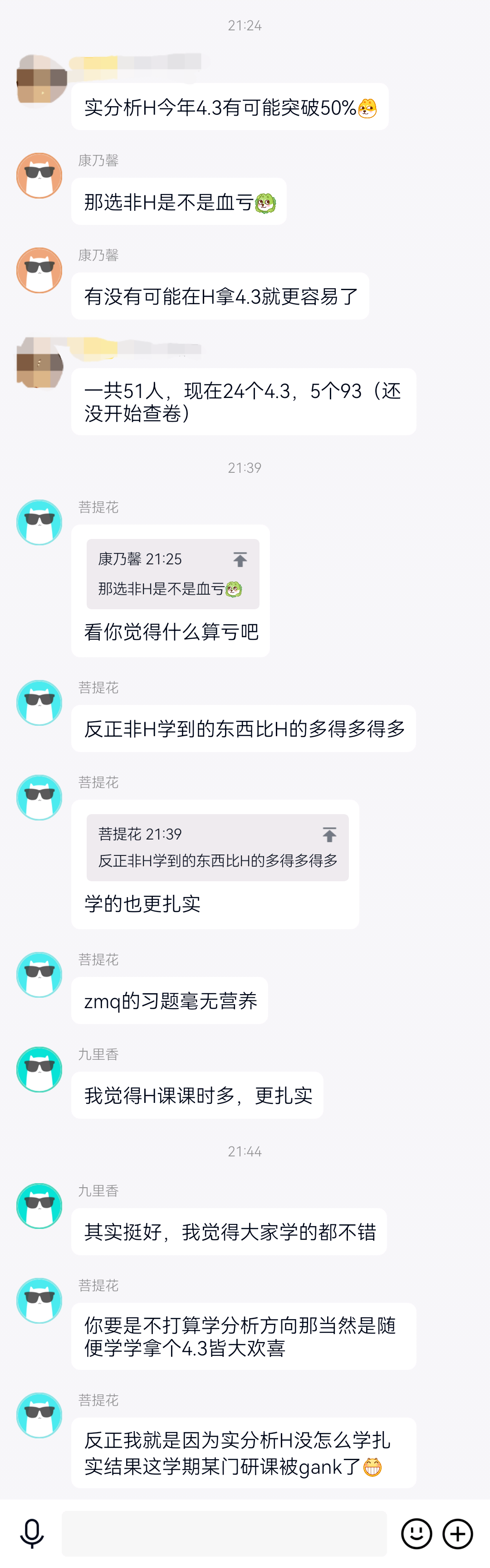 作为一个并不擅长也不太喜欢学比较抽象的数学的人,我选H单纯是因为任✌️的给分还有强基的要求。但是学了之后才发现,我能做的只有不断的看之前录课把PPT里每一个不懂的地方稍微搞懂一点,理解PPT里最浅显的思想罢了,考试两次都没到平均分,也是意料之中。