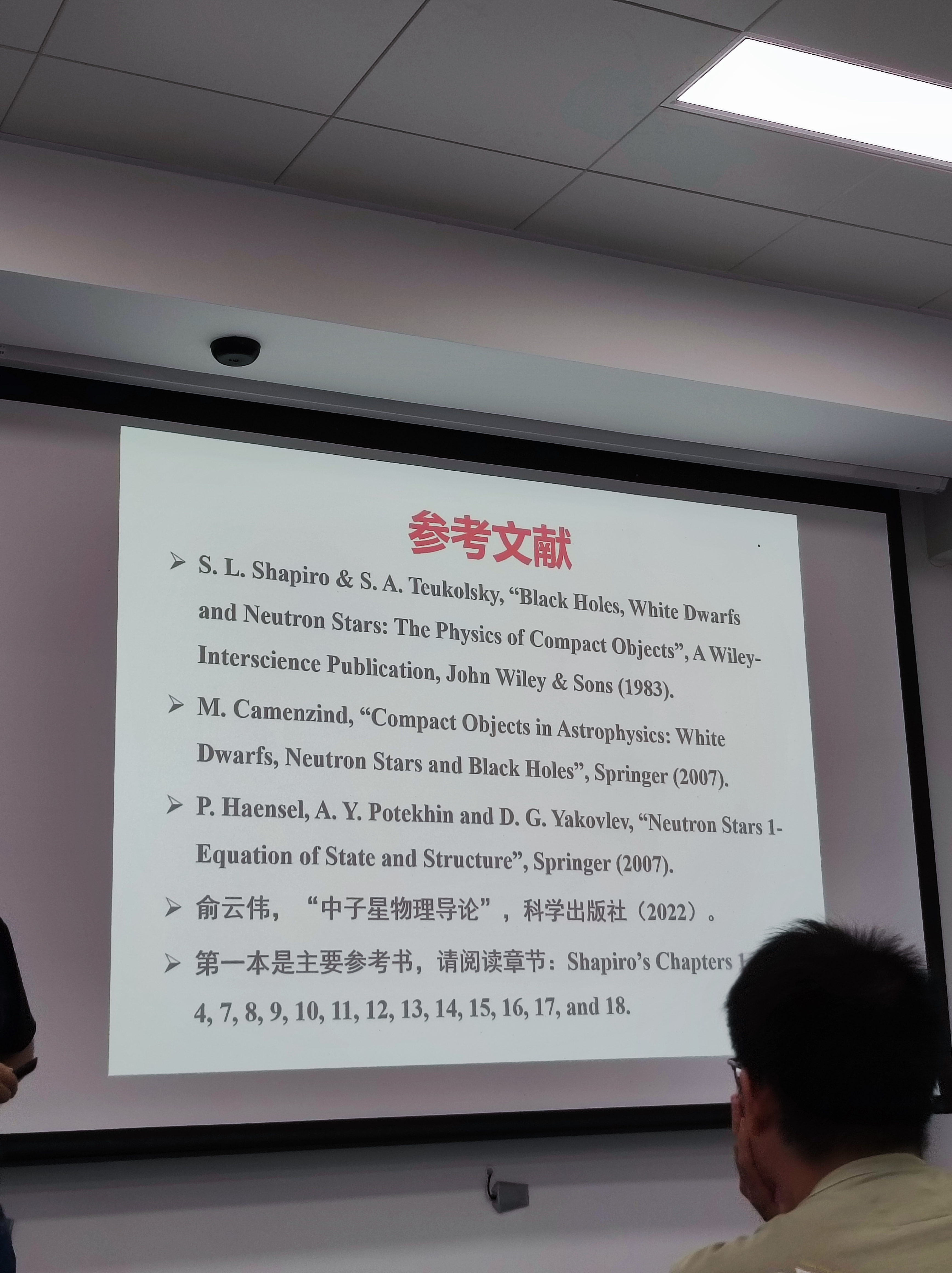 这门课主要讲授白矮星、中子星和黑洞的形成、结构、冷却、演化以及爆发现象。教材是 Shapiro(在上世纪八十年代)写的 Black holes, White Dwarfs, and Neutron Stars: The Physics of Compact Objects,有六百多页,老师建议课后有时间可以把这本书看完。参考书有 Compact Objects in Astrophysics by Camenzind,以及《中子星物理导论》by 俞云伟。实际授课内容涵盖教材除了第五章、第六章以外的几乎全部内容(有些章节不是全讲,而且由于课时不够,最后几章讲得十分简略,甚至最后一节课以飞快的速度讲了引力辐射、核坍缩超新星等巨多的内容)。