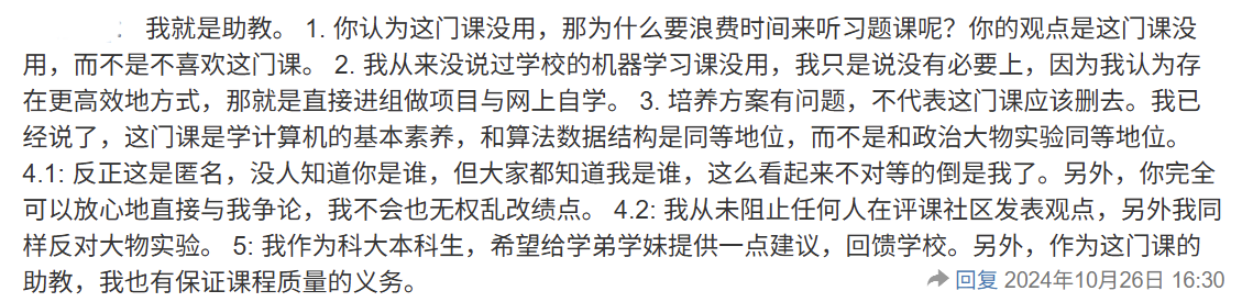 12月实验轮番轰炸不说,关键是你实验给反馈啊,你用个英语文档,一些细节含糊不清,也不出分,代码检查是脚本改的,万一有同学因为一些细节就把代码分全扣了怎么办,等到出总评了再调查吗?不知道为什么每次实验不出分,不给一些反馈,是害怕学生找麻烦吗。(实验文档写的稍微清楚点,一些标准说清楚点也行啊),这门课评分这么低不是没原因的