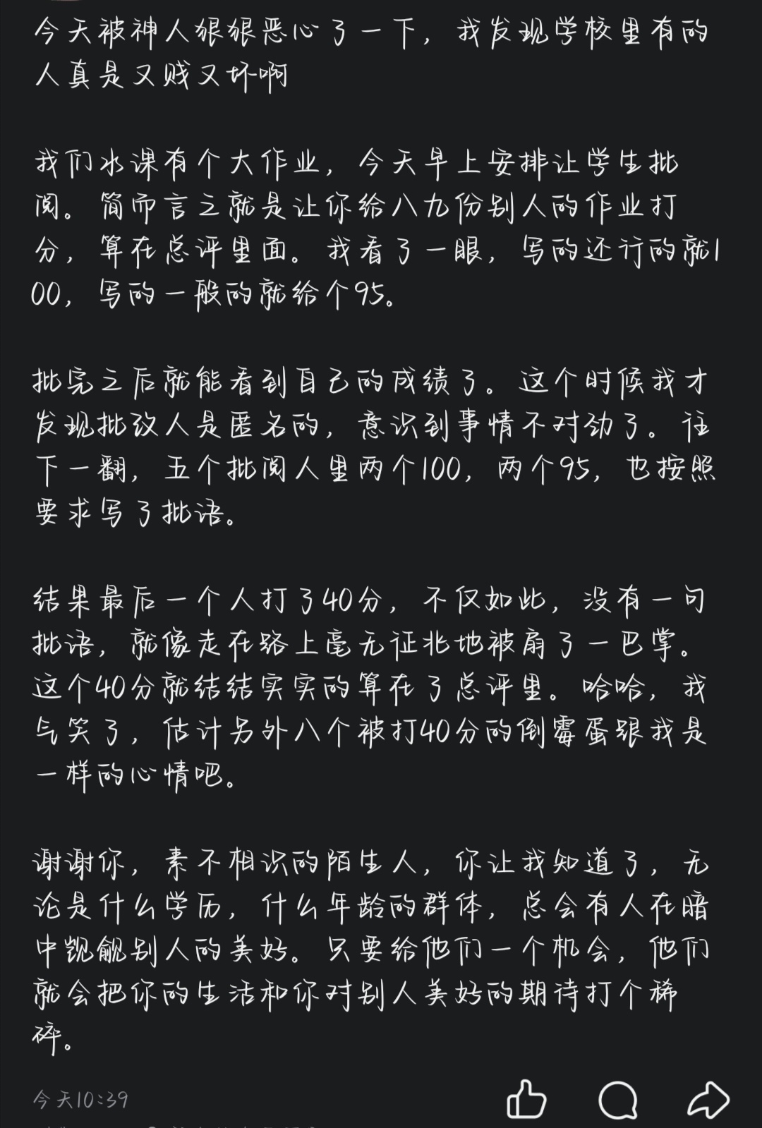 那位毫不犹豫打下低分的同学,他会和往常一样生活,甚至还会因为拉低了别人的分数而沾沾自喜。也许之后出了社会也会是这样?偷奸耍滑的人处处有好处,认真干事的人反而被踩一头。我觉得在大学里就有这种人是挺悲哀的事情