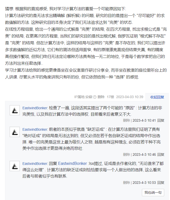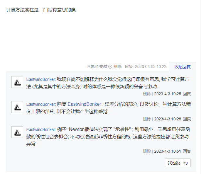 就我所见周围很多选修过计算方法的同学学长 (计科为主) 都认为这是一门无聊且无用至极的课, 从 "手算方法" "证明方法" 这样的绰号中也可以看出一点学生们对它的不满. 不过我上了一两个星期后就觉得计算方法实在是一门很有意思的课, 虽然我目前还不能完全解释: 自己在学习中感受到这种激动与兴奋究竟从何而来......