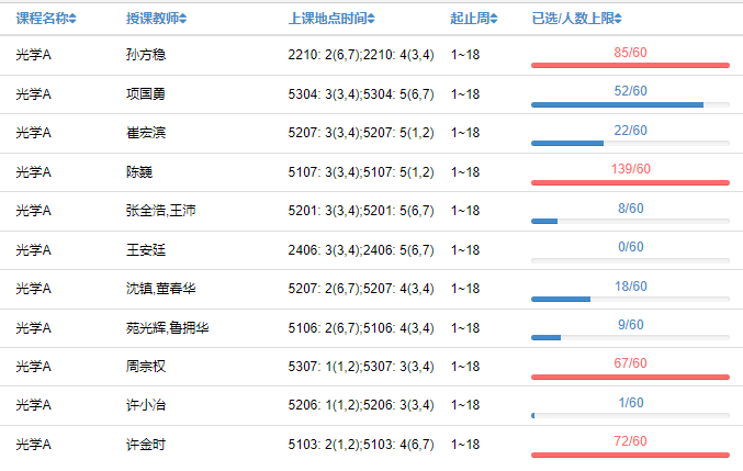 从2021级开始,一些全校通修课程(数分、概统等)逐渐由置课变为预选阶段自选并统一抽签,这样一来,预选结束前的待抽签人数也就更能够反映选课意愿(当然也收到别的一些因素影响)。以下是2022秋“光学A”预选结束而尚未完成抽签时的选课人数,其中我只保留了部分信息: