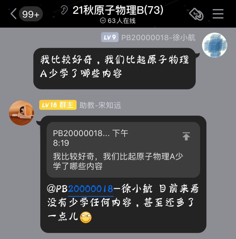 老师人很好,试卷也出的不难,做些往年卷子也能发现好多题目都出现在了期末考卷里。2个小时的考试计算量也不大,1个小时就能全部写完,考试的时候有不少人提前交卷,不过我还是拖到时间到才交卷,最后总评98分。我是自认为物理比较差的那一类,老师能给到这个分则是十分满意。这门课想上课的时候就全部听懂掌握我觉得还是比较难的。老师发的ppt很全面,考前建议把ppt里的重要内容手抄一遍,这门课主打一个结论记忆。不过出现的微分方程的解法通通不需要掌握,大概只需要会解无限深势阱就可以了。另外这门课的助教人也很好,两个助教经常开习题课,考前还有答疑课,解答都很详细,比光学助教好太多了。😃👍