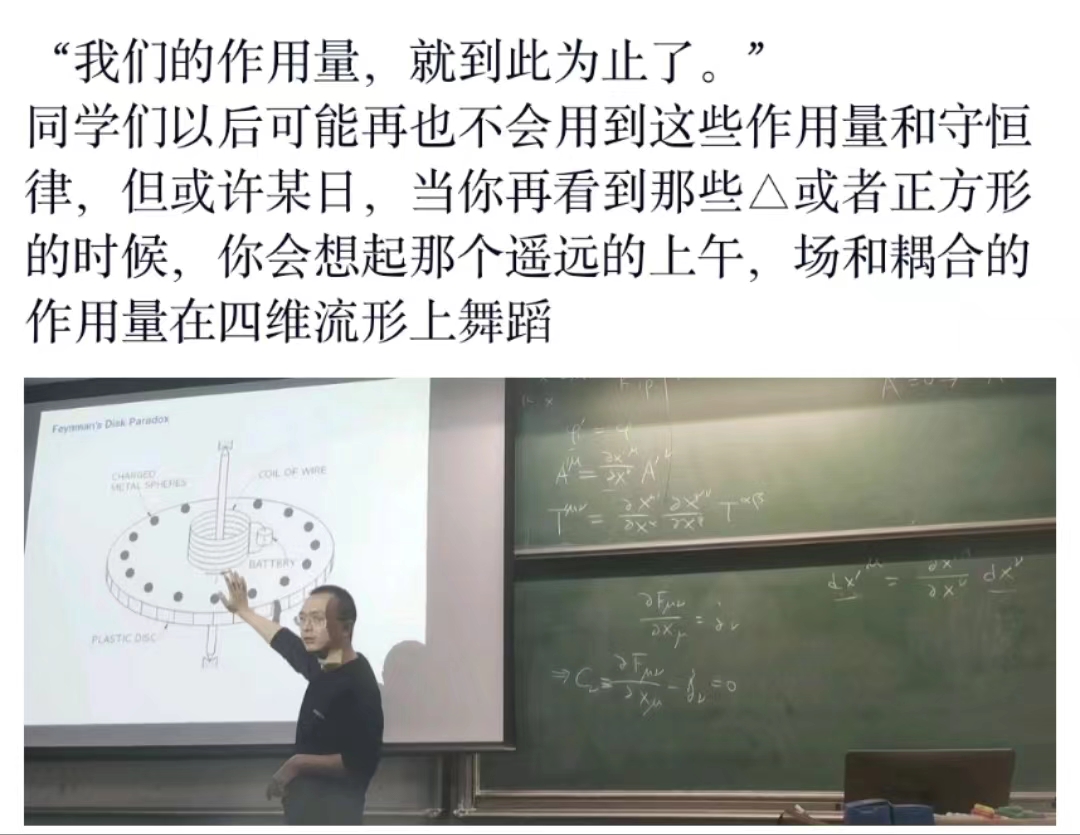 而陶老师的课程前半部分注重把电动力学看成经典场论中的一个典例、来看看电动力学是如何使用经典场论语言、使用狭义相对论语言描述的(注意,从经典场论是推不出电动力学的,一块橡皮膜也可以用经典场论描述)。我是上朱界杰老师的理论力学课的,所以前半部分算是比较熟悉。同学们喜欢开玩笑,说朱界杰老师是给我们补数理基础的(这也是我开头说大一同学可以考虑的原因),这么说的话,陶鑫老师就是“如果你之前补得不够牢固,还可以再捞一捞人”,而更赞的是陶老师的课一定程度上雅俗共赏,不同水平的同学都可以学到点东西。