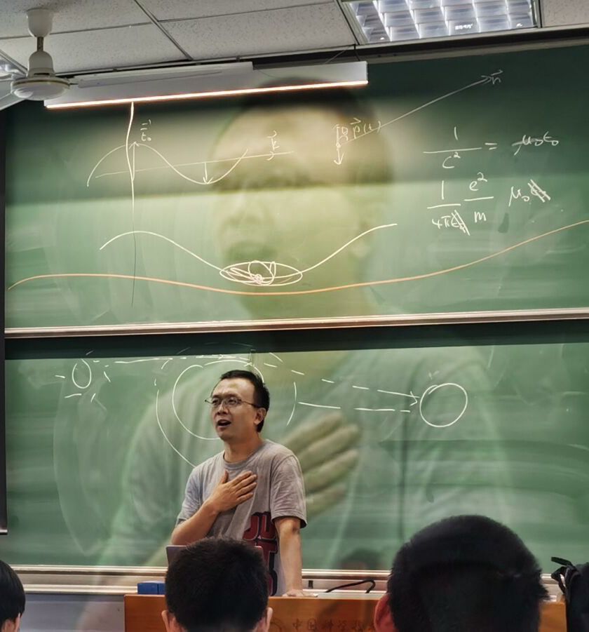 陶老师总是喜欢在介绍完理论知识后给出“快速的实例”、给出知识间的联系。印象深刻的是,在讲狭义相对论时,由于时间和空间的地位相当,陶老师便顺带提到“d'Alembert方程是满足相对论的,因为对时间和空间都是二阶偏微分;而Schrodinger方程就不是,因为对时间是一阶偏微分而对空间是二阶的”,当时颇有醍醐灌顶之感。讲电磁场的能量和动量,陶老师让我们思考Poynting矢量与动量密度为什么会有这种关系,指出这关系对一般的体系也成立,还联想到他面试研究生时也出过这问题,并很通俗地向我们解释清楚。讲真空中的平面电磁波,提到色散关系,陶老师便提到从色散关系反推场方程,并举了从相对论的能量、动量关系得到Klein-Gordon方程的例子。讲电磁辐射,联系到引力场中的辐射,联系到超人飞行时那伸展的双臂……
