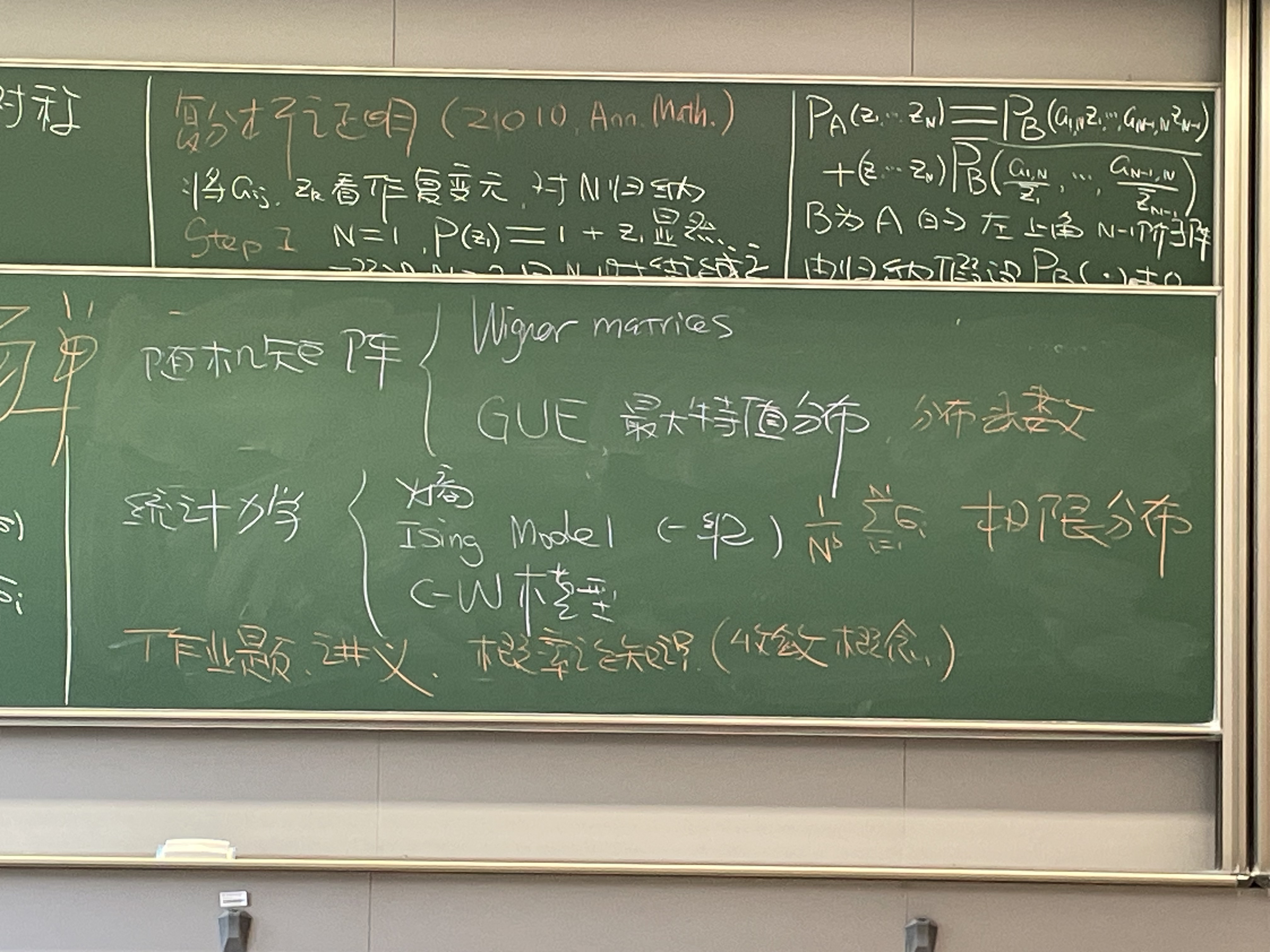 课程前半段讲lindegerg替换、半圆律、高斯正交系综、Carleman条件等,后半段在讲信息熵和统计物理模型。