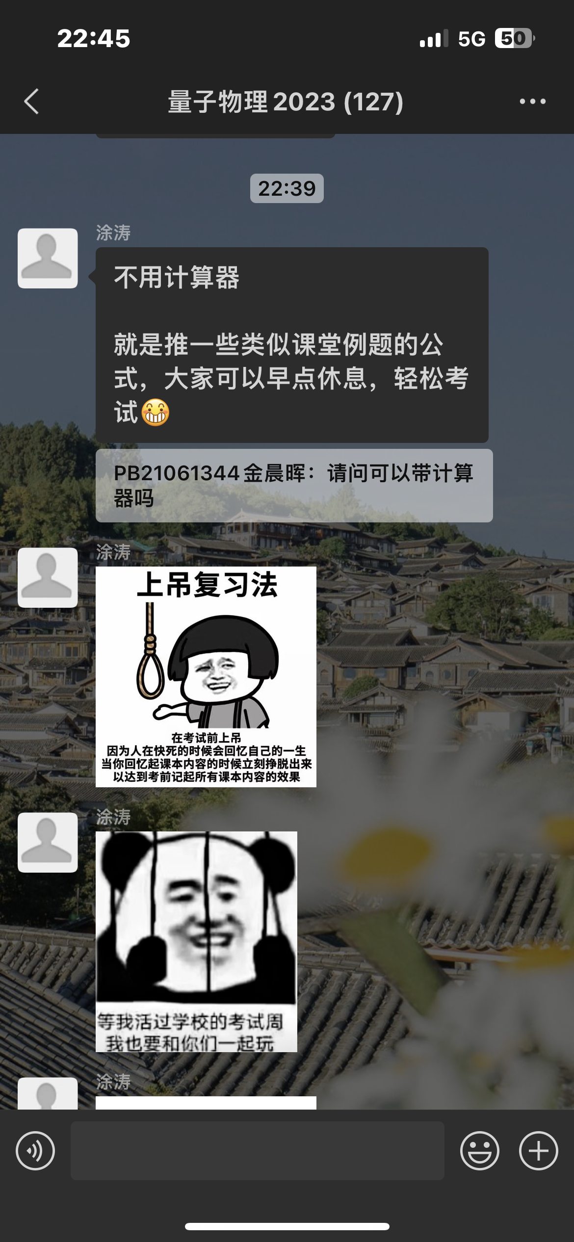 考试:考试100分,涂爹这样规划的:每道题写出薛定谔方程给一半分,最后就有50分,而涂爹最后一道题是一个十分题:写出印象最深的公式或者图像。他的目的是直接白送我们60,让我们不可能不及格。但是!最后一道题不用写薛定谔方程,所以白送了我们55分哈哈哈。我考试时没写出一道题最后97。