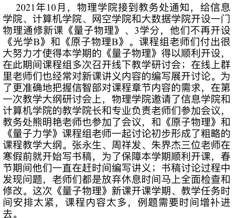 四个月的时间能编写完一套好的讲义吗?我想不能,实践也证明这套教材纰漏百出,前后颠倒。我想问题的根源并不在于编写教材的老师,任何人在短短几个月的时间内也无法编写好一套适用于非物理专业教学的量子物理讲义。
